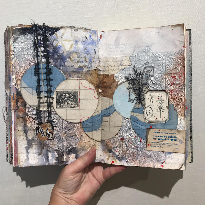 I was inspired this week by the falling leaves here in Northern Michigan and the pouncing tiger stencil from Stencil1. I sprayed SethApter Izink sprays in (Sunflower, Honey, Wild Rose, Pomegranate, and Licorice) onto a silicone mat and pressed a hexagon-shaped Gelliarts gel plate into the ink and then onto vintage ledger pages. I next used...