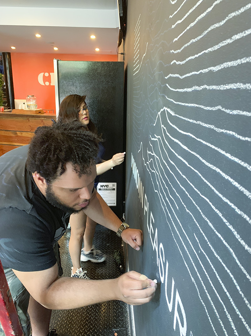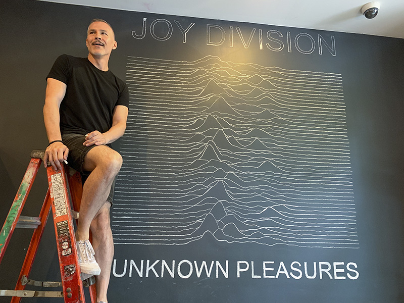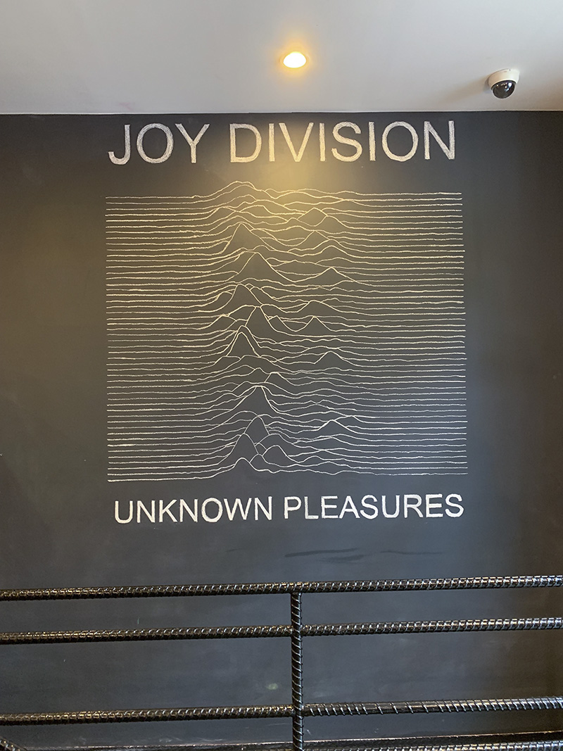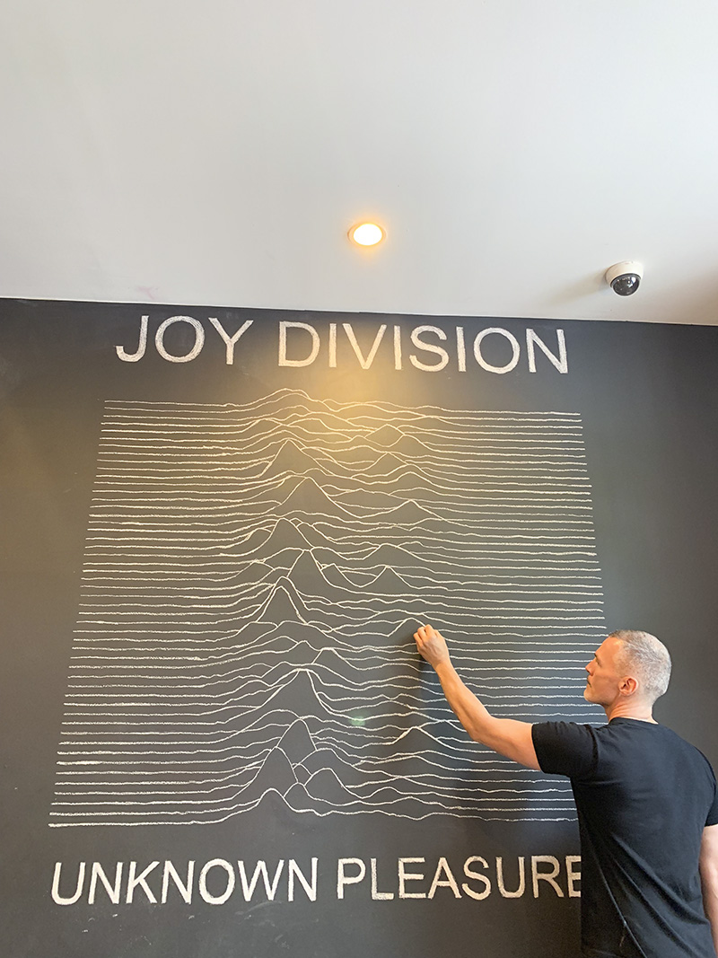 When the owner of Chalk Gyms asked us to re-create Joy Division’s iconic Unknown Pleasures album cover, I was elated. I remember the day my best friend in high school, Betsy, pulled up in her 50 foot Buick for us to do our usual after school ride around and she popped this cassette in.