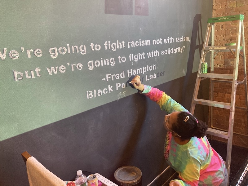 Yuli is a team member at Stencil1, she’s blocking in the basic shapes of the letters, for Fred Hampton’s quote.