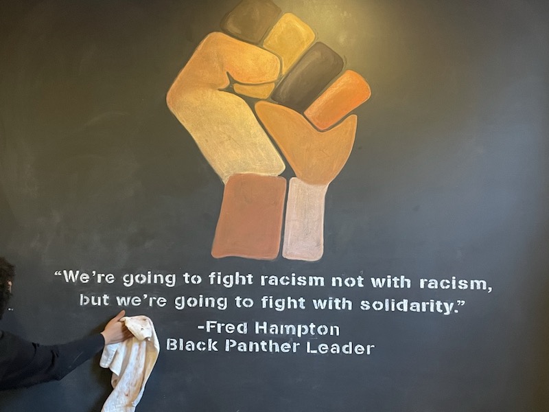 Here at Stencil1, we are proud to work within the community to promote human rights activism and civil rights movements. It is black history month! And we think it’s a great opportunity for us to unite and also raise awareness about America’s history. Using only chalk, some of our designers were given the opportunity to draw this power fist. Under the direction of Chalk gyms, we came up with this design, with a quote from American activist and Chicago Black Panther Leader, Fred Allen Hampton, close to the entrance of Chalk Gyms, Brooklyn.