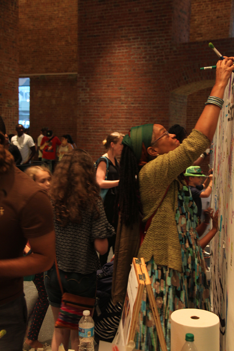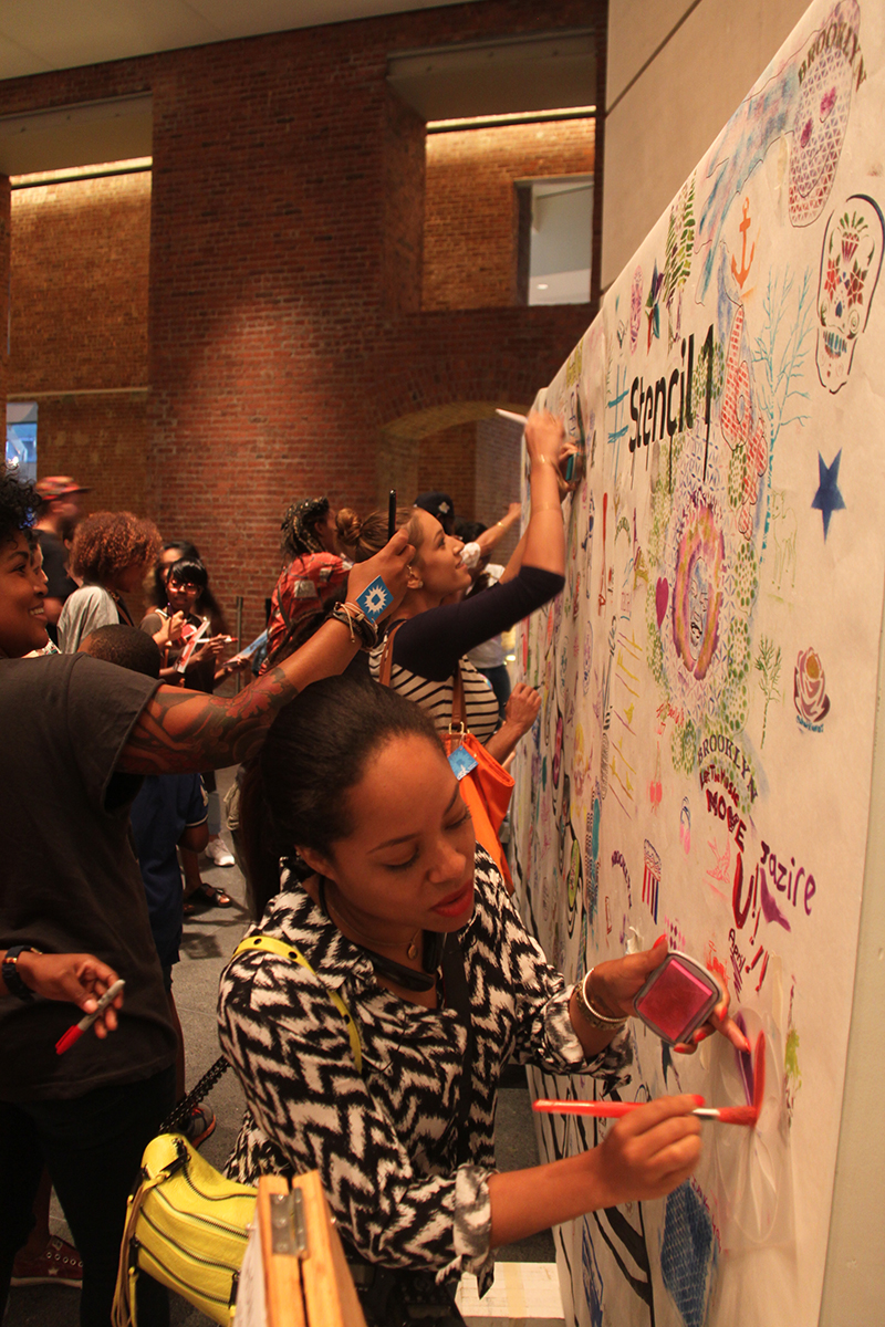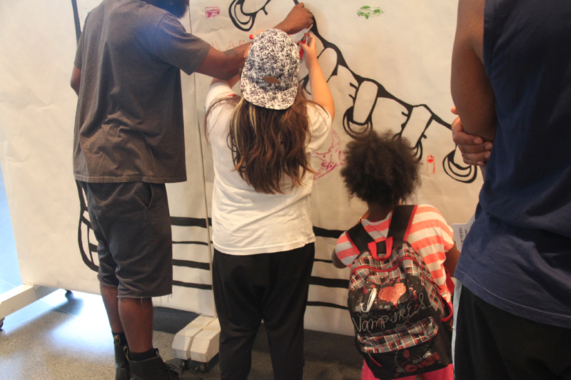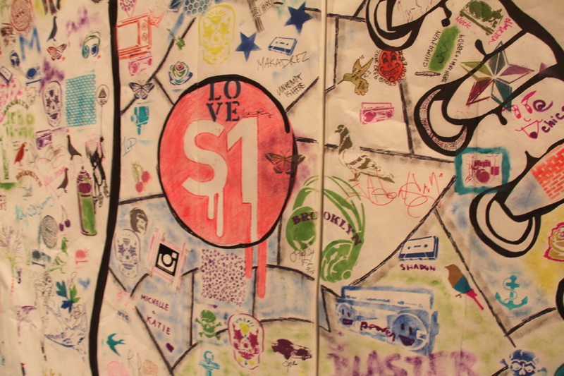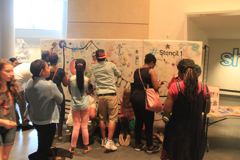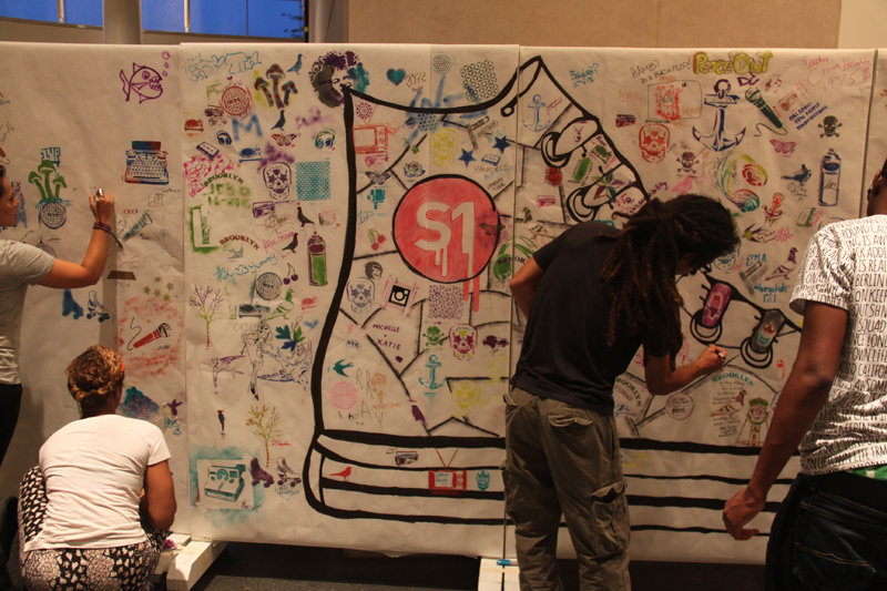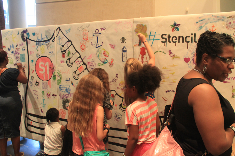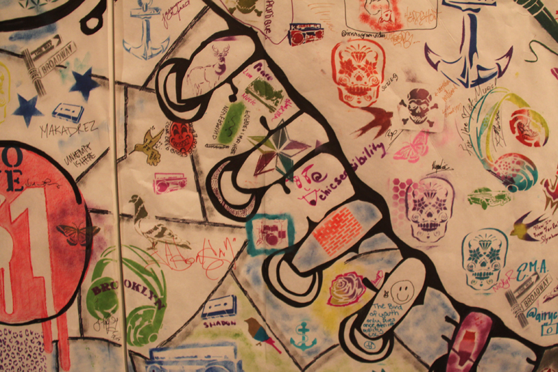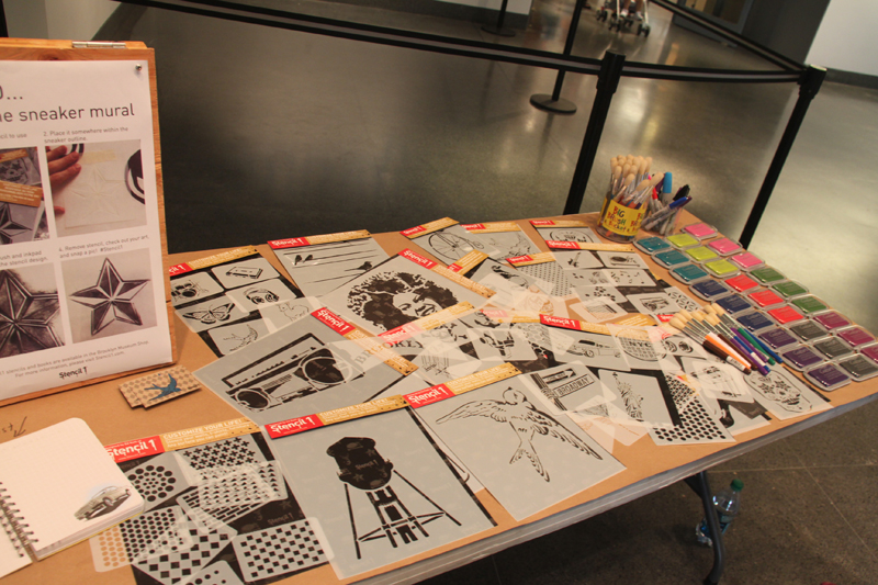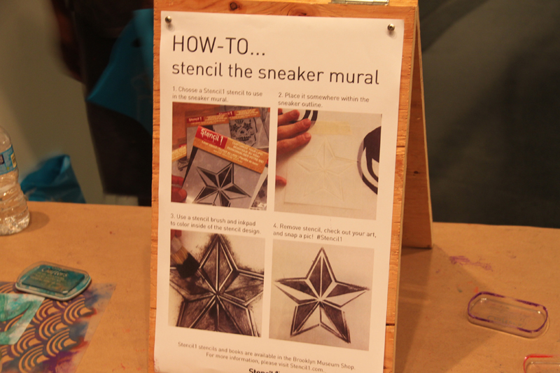 Last Thursday, we spent our evening at the Brooklyn Museum‘s Art Off The Wall: The Rise of Sneaker Culture exhibit! Many artists of all ages gathered together to collaborate and stencil graffiti in our 12-foot wide drawing of a sneaker mural.