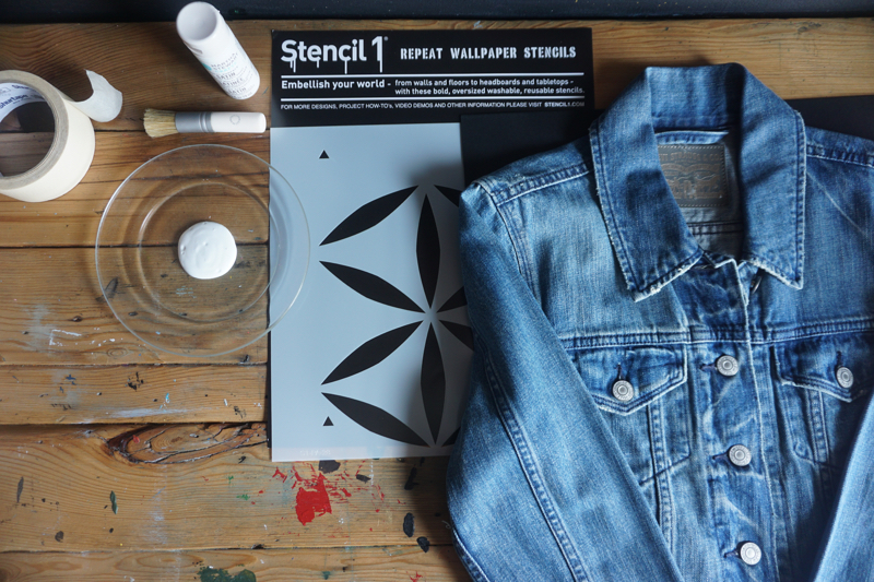 Things you will need: Denim jacket, fabric paint and paint brush, cardboard, tape, low-tack spray adhesive, pencil, paper towels, Stencil1 Moroccan Petal Repeat Pattern stencil.
