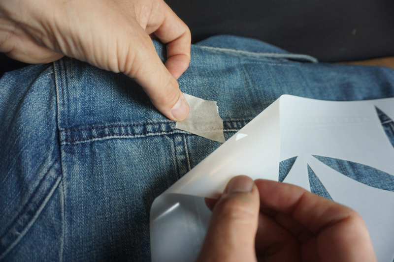 Place a small piece of tape underneath the registration marks and trace the mark with a pencil. Tape down the stencil onto the jacket to help keep the stencil in place while painting. Also, tape down any edges you do not want to paint for a clean finish.