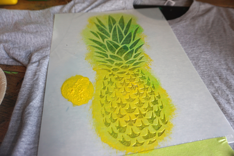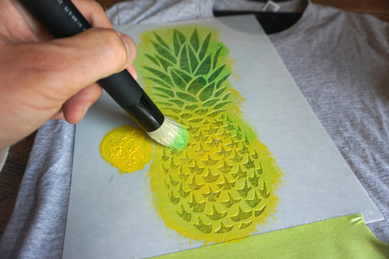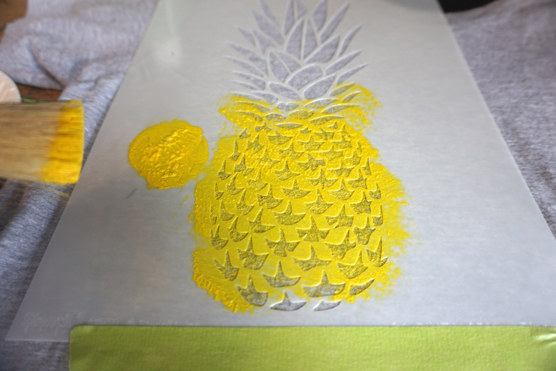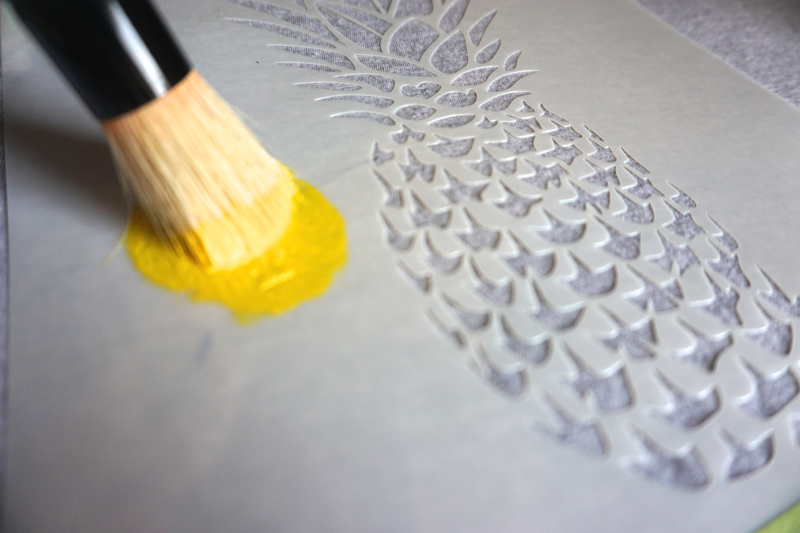 Using the yellow color, load up your brush. Dab excess paint on a paper towel, or even on the uncut sides of the stencil! This dry brush method will ensure paint won’t bleed underneath the stencil and the finished product will look as clean as a possible. This method is especially helpful for detailed stencils like the Pineapple stencil.
