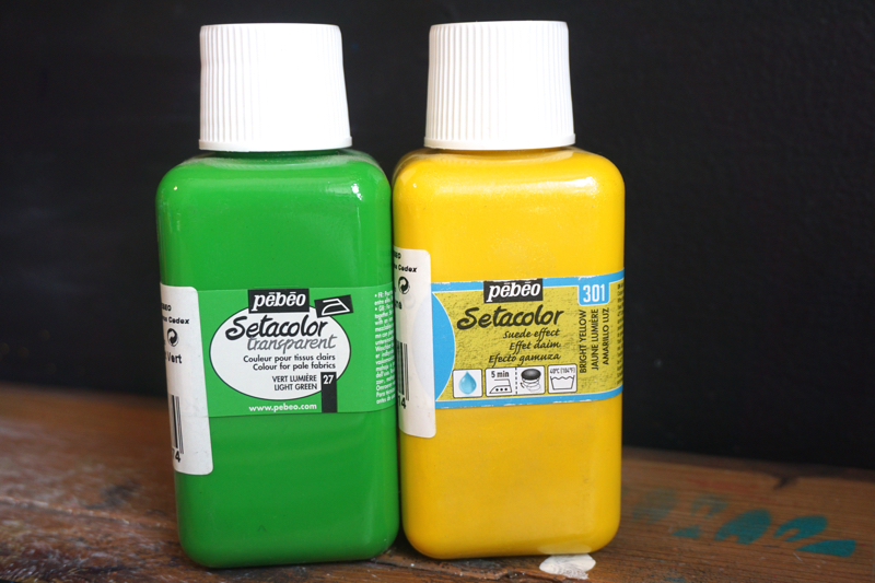 Get your paint ready. Here, we’re using Pebeo’s Setacolor Transparent in Light Green and Suede Effect in Bright Yellow, which gives an awesome suede finish when dry!