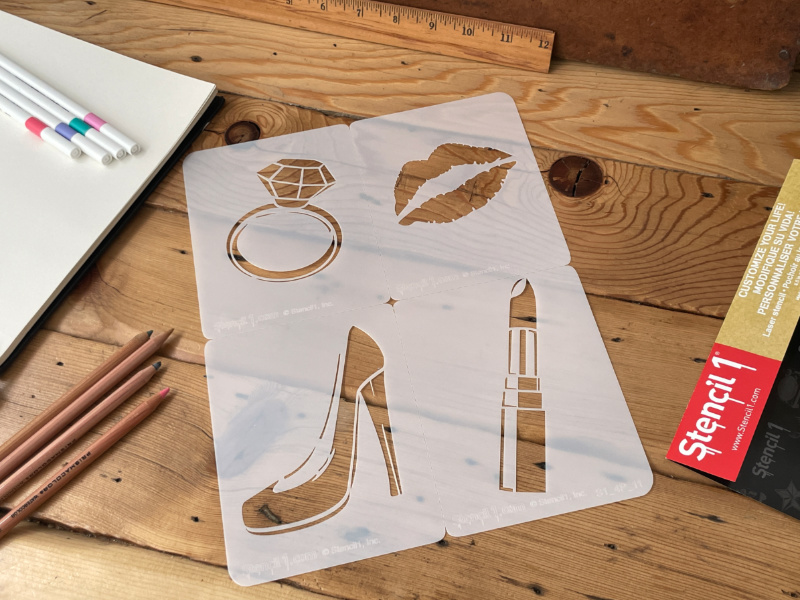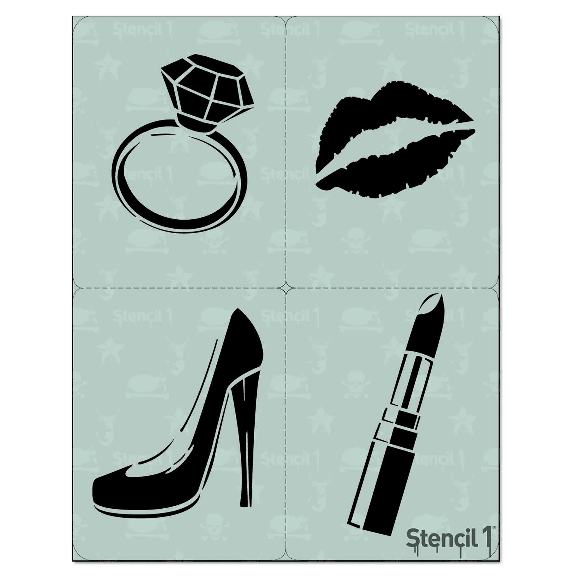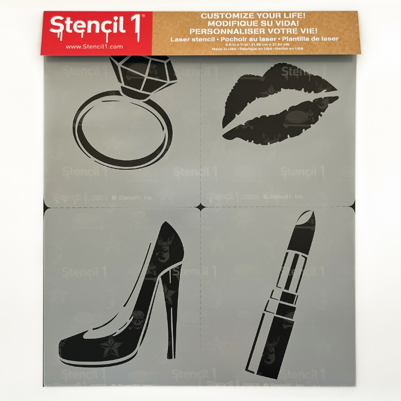 This Stencil1 4 Pack Diva Set stencil gives you multiple stencils, cut on one sheet, including a diamond ring, lipstick, heels, and a big kiss! Be a diva or just act like one. Perfect for clothing or home decor. Layer another Stencil1 stencil on top for a more complex design. Made of mylar, this stencil is washable, reusable and compatible with paints, inks, markers, pencils and more. Can be applied to a variety of materials, including wood, paper, fabric, metal, ceramic, concrete and glass. Show us how you create with Stencil1 by tagging #stencil1 for a chance to be featured on Stencil1.com.