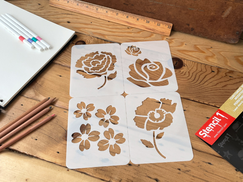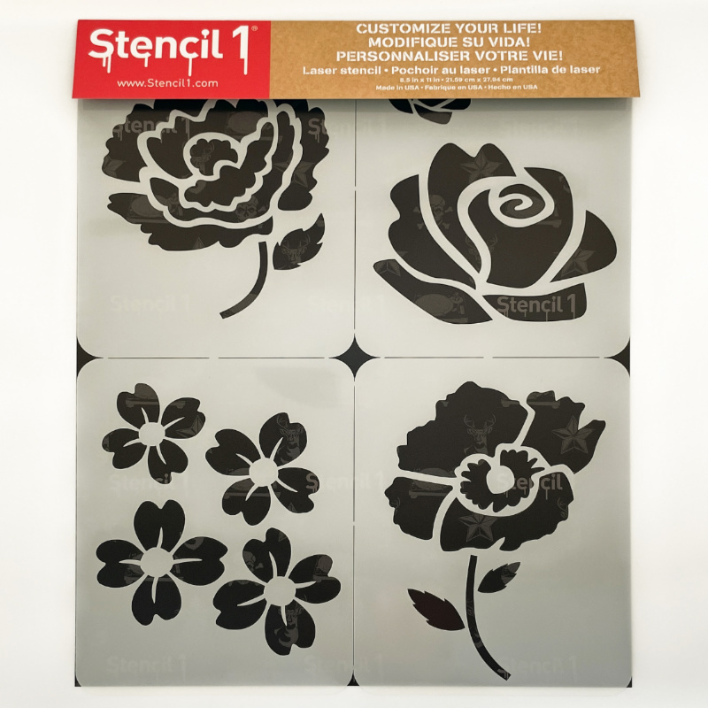 • The Stencil1® Flower 4-Pack Peony, poppy, rose, sakura Multipack 4ct – Stencil 8.5″ x 11″ contains one 8.5″ x 11″ mylar sheet with four stencils
