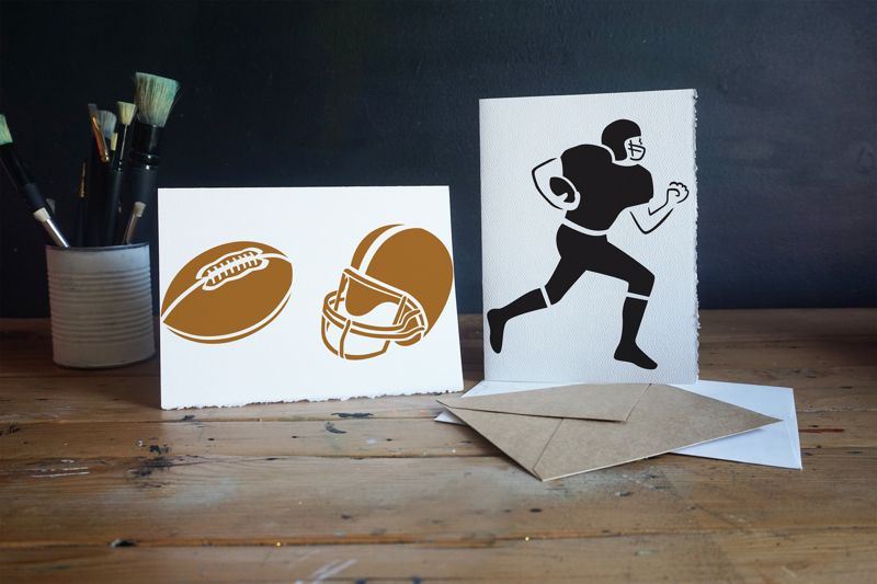 Touchdown! This Stencil1 4 Pack Football stencil gives you multiple stencils, cut on one sheet, including a football, helmet, goal post and football player. Add these icons to your clothes or mixed-media projects, they are sure to score extra points! Made of mylar, this stencil is washable, reusable and compatible with paints, inks, markers, pencils and more. Can be applied to a variety of materials, including wood, paper, fabric, metal, ceramic, concrete and glass. Show us how you create with Stencil1 by tagging #stencil1 for a chance to be featured on Stencil1.com.