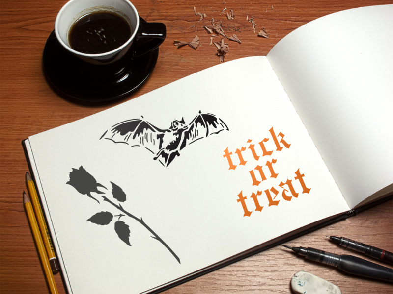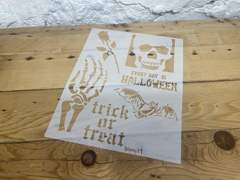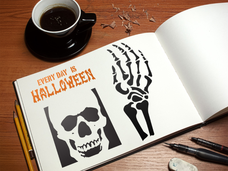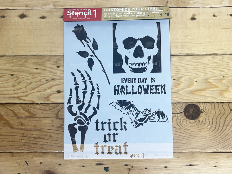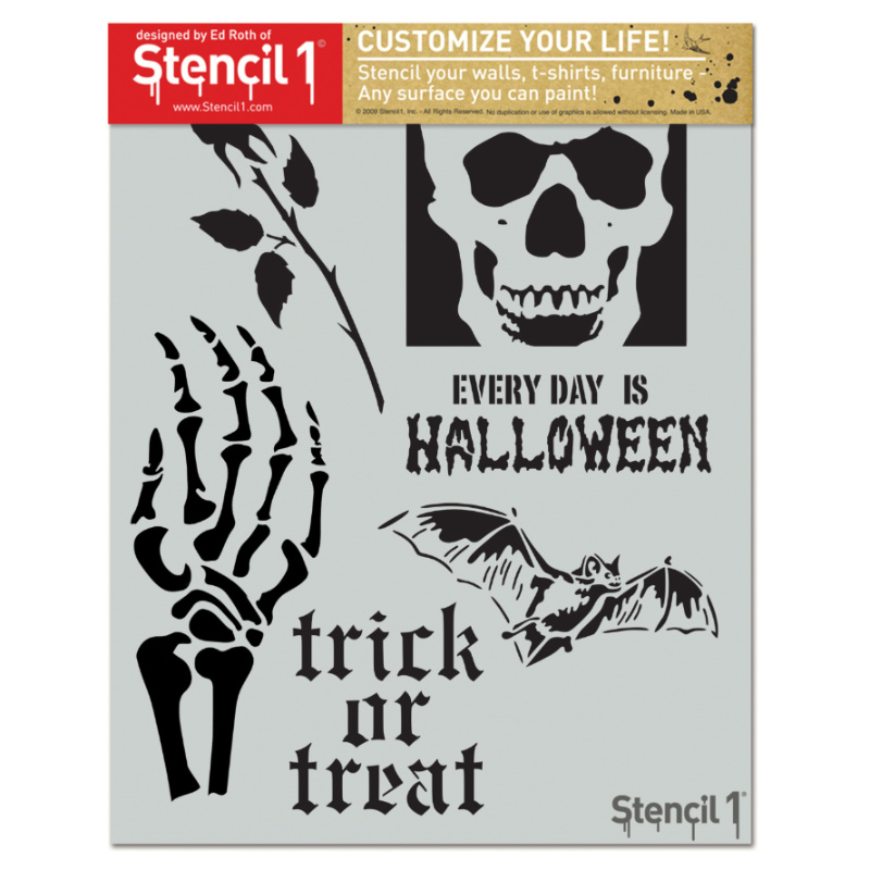 This Stencil1 6 Pack Mini Halloween stencil gives you multiple Halloween-themed stencils, cut on one sheet, including a Skull, “Trick or Treat” Sign, “Every Day is Halloween” sign, Skeleton hand, Rose, & Bat. These stencils will make your Halloween projects extra spooky and cool! All of our Halloween stencils can be used to customize clothing and costumes, create Halloween party invites, stencil trick-or-treat bags, and, of course, paint pumpkins! Have a Halloween crafting party! Layer with another Stencil1 stencil for a more complex design. Made of mylar, this stencil is washable, reusable and compatible with paints, inks, markers, pencils and more. Can be applied to a variety of materials, including wood, paper, fabric, metal, ceramic, concrete and glass. Show us how you create with Stencil1 by tagging #stencil1 for a chance to be featured on Stencil1.com.