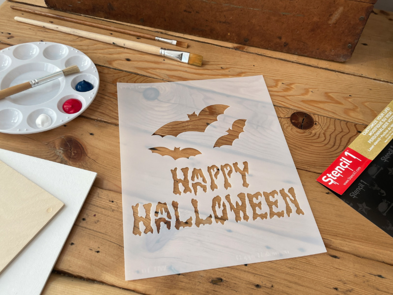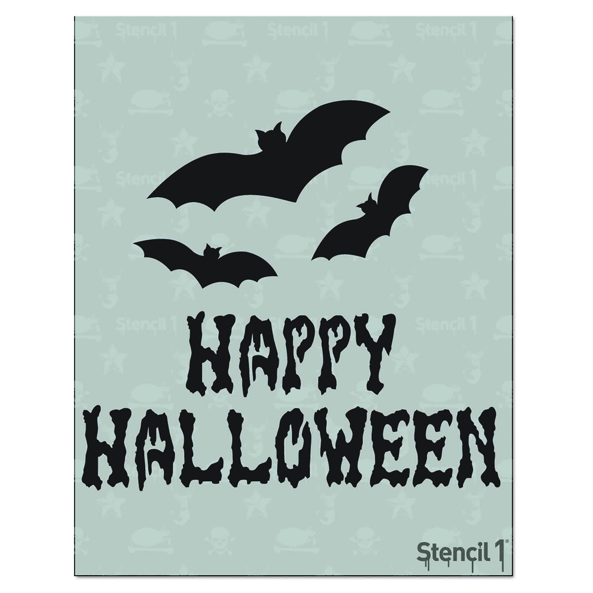 - The Stencil1® Happy Halloween with Bats– Stencil 8.5″ x 11″ contains one 8.5″ x 11″ mylar stencil