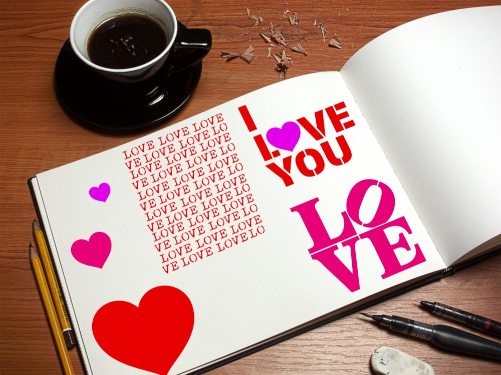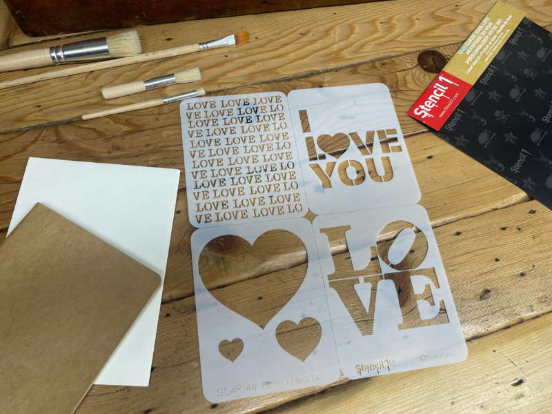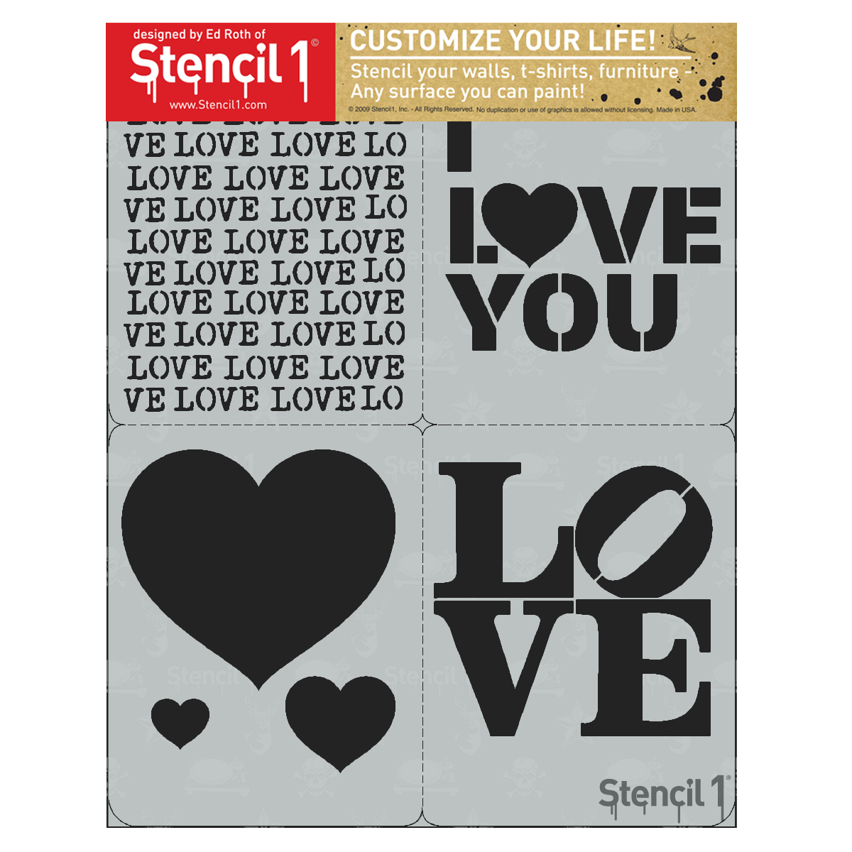 • Love + Hearts 4-Pack – Stencil 8.5″ x 11″ contains one 8.5″ x 11″ mylar sheet with four stencils that are 4.25″ x 5.5″ each
