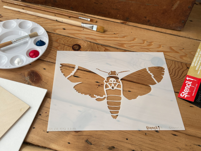 This Stencil1 Moth with Skull stencil is great for many surfaces. Layer with another Stencil1 stencil for a more complex design. Made of mylar, this stencil is washable, reusable and compatible with paints, inks, markers, pencils and more. Can be applied to a variety of materials, including wood, paper, fabric, metal, ceramic, concrete and glass. Show us how you create with Stencil1 by tagging #stencil1 for a chance to be featured on Stencil1.com.
