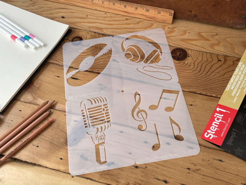 This Stencil1 4 Pack Music V2 Set stencil gives you multiple stencils, cut on one sheet, including a record, headphones, vintage mic and music notes. Perfect for customizing your wardrobe or home. Layer with another Stencil1 stencil for a more complex design. Made of mylar, this stencil is washable, reusable and compatible with paints, inks, markers, pencils and more. Can be applied to a variety of materials, including wood, paper, fabric, metal, ceramic, concrete and glass. Show us how you create with Stencil1 by tagging #stencil1 for a chance to be featured on Stencil1.com.
