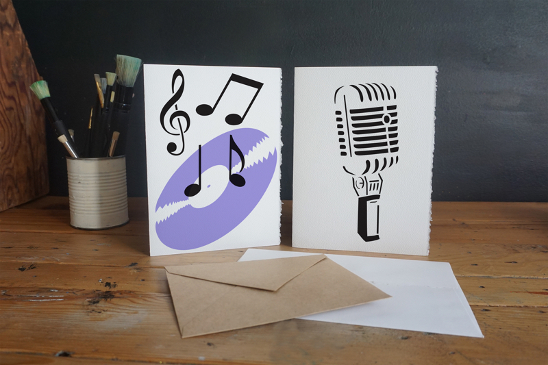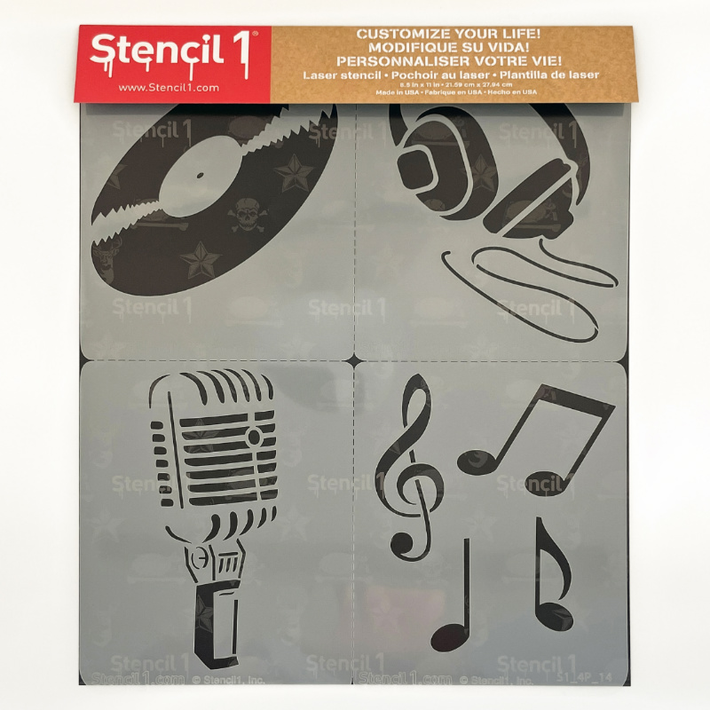 A record, headphones, a vintage mic, and some musical notes make up this music v2 4-pack set. Show your love for music by stenciling t-shirts, notebooks, and more!