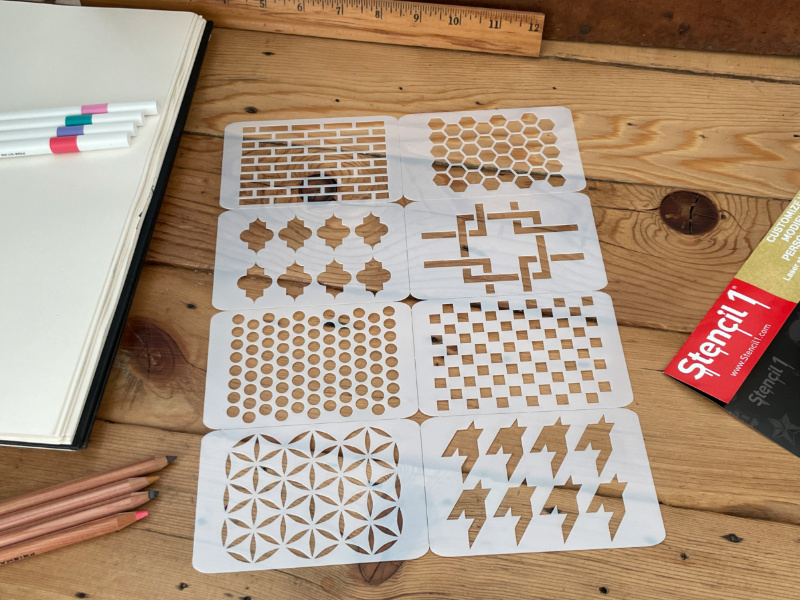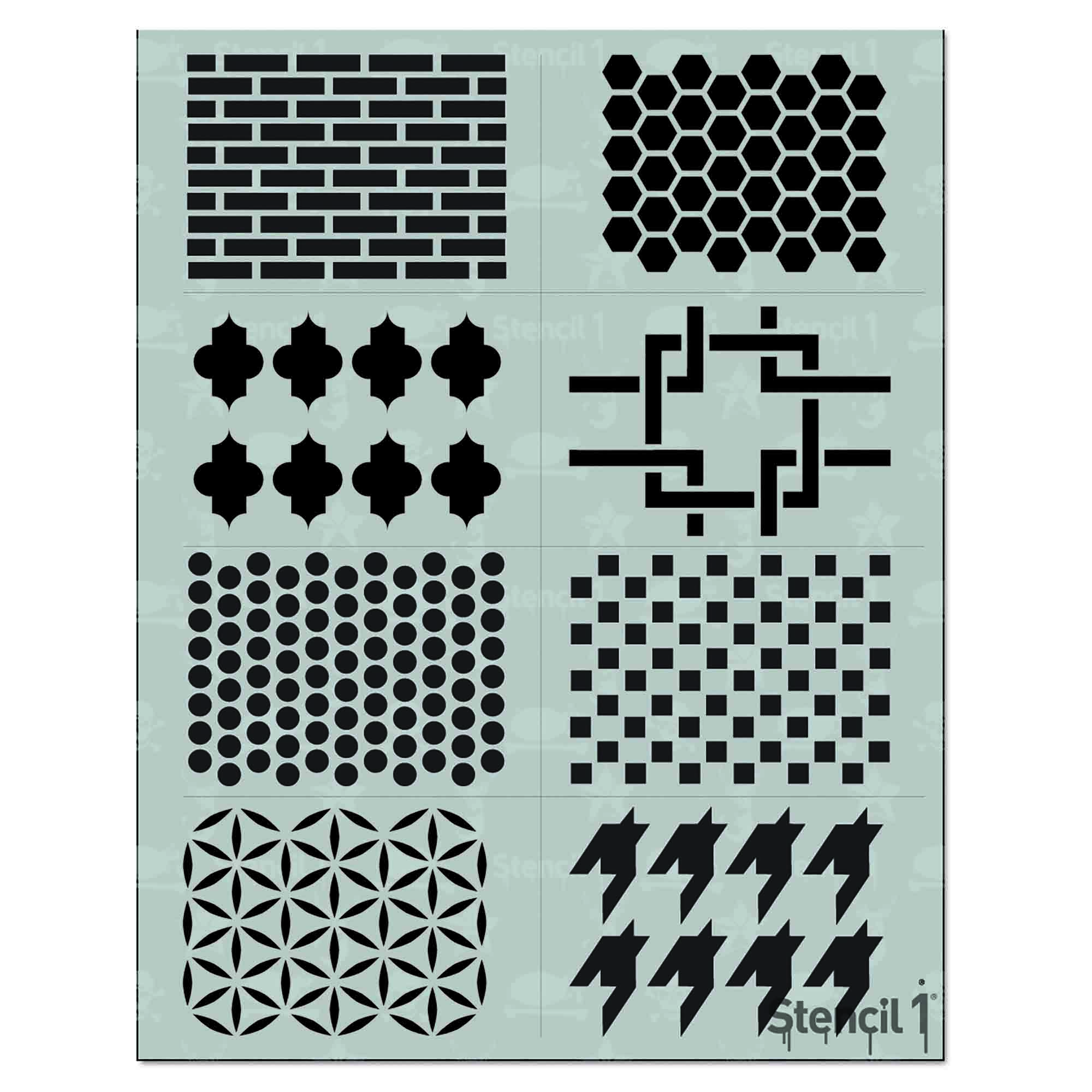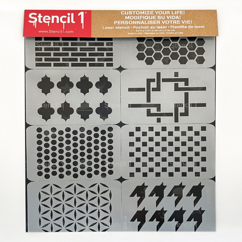 This Stencil1 8 Pack Patterns stencil gives you multiple stencils, cut on one sheet, including 8 smaller-sized pattern stencils. Each measures approximately 4 in. x 2 3/4 in.. Layer with another Stencil1 stencil for a more complex design. Made of mylar, this stencil is washable, reusable and compatible with paints, inks, markers, pencils and more. Can be applied to a variety of materials, including wood, paper, fabric, metal, ceramic, concrete and glass. Show us how you create with Stencil1 by tagging #stencil1 for a chance to be featured on Stencil1.com.