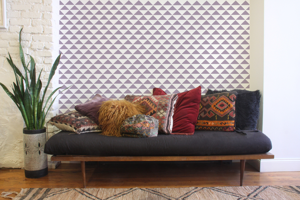 This 22″ x 66″ Staggered Triangles Repeat Pattern Pro Stencil is designed to repeat from top to bottom of your wall, creating a wallpaper effect on your walls. Transform any bedroom, living room, or office with this bold and trendy wall stencil! Paint these all-over stencils any color to perfectly match your home decor.