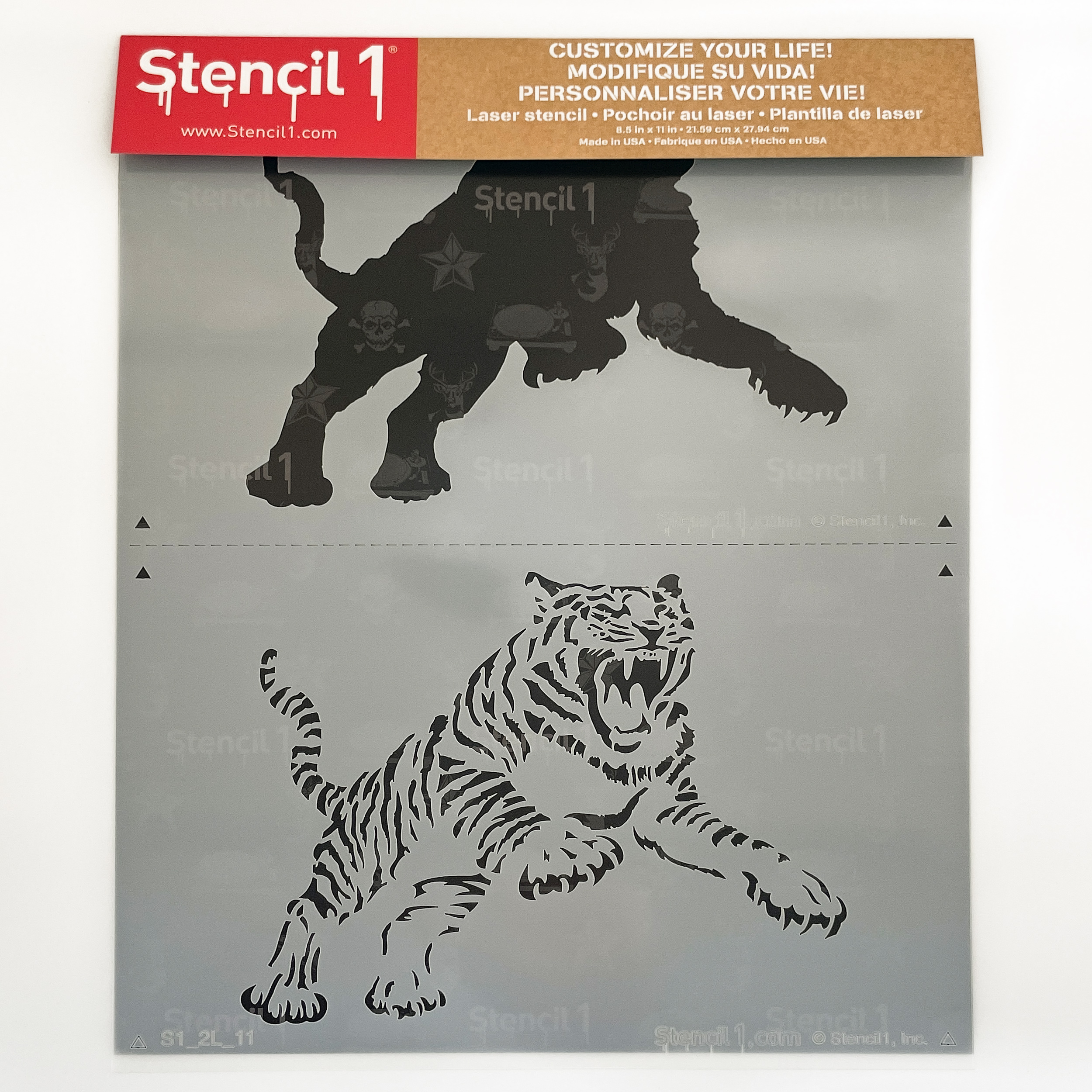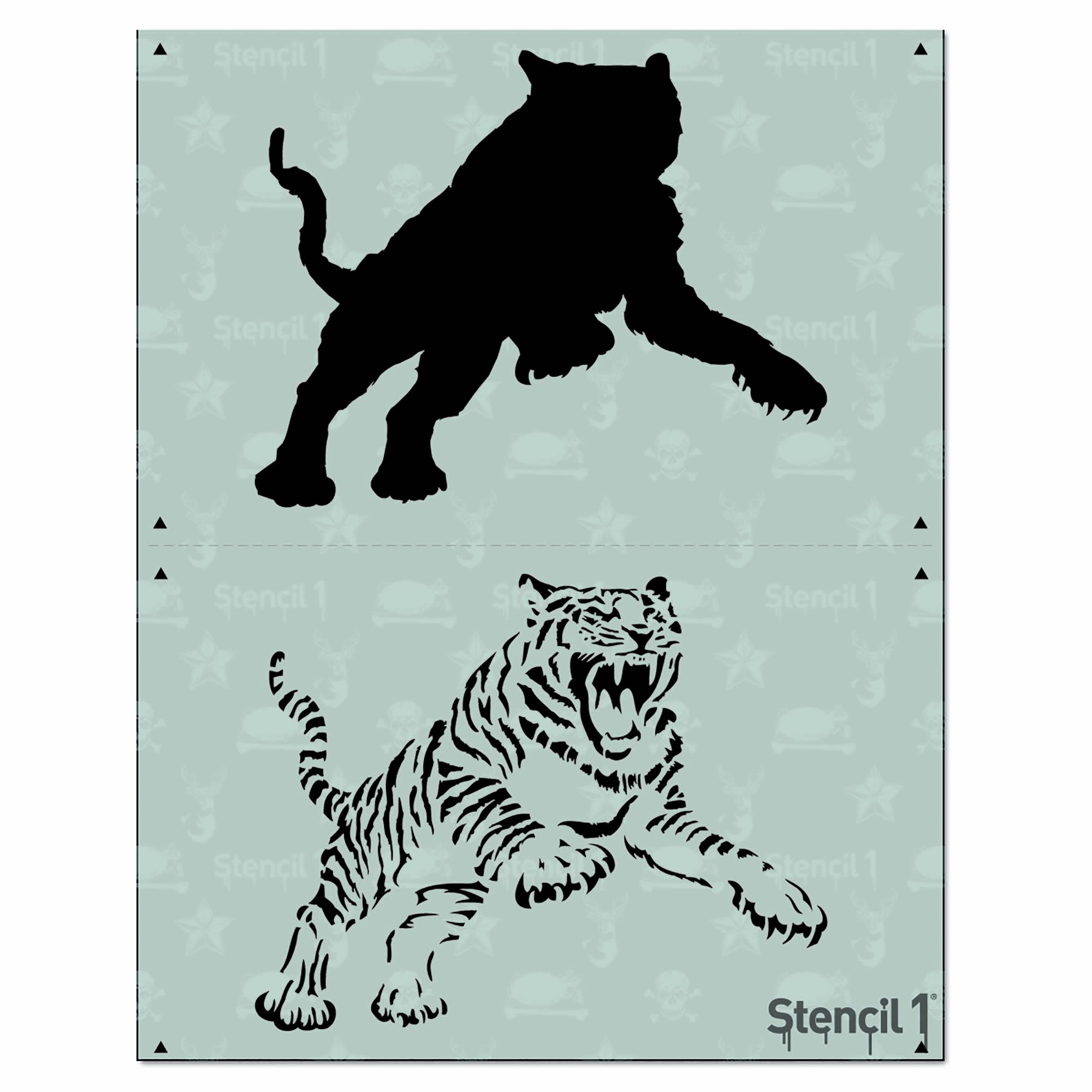 The Stencil1® Tiger – Layered Stencil 8.5″ x 11″-  This two-layer tiger stencil includes a silhouette stencil and a detailed stencil. Cut on an 8.5″ x 11″ sheet, the design area measures 8.5″ x 5.5″.