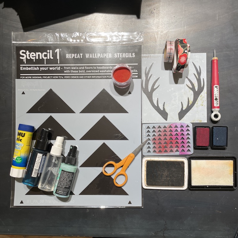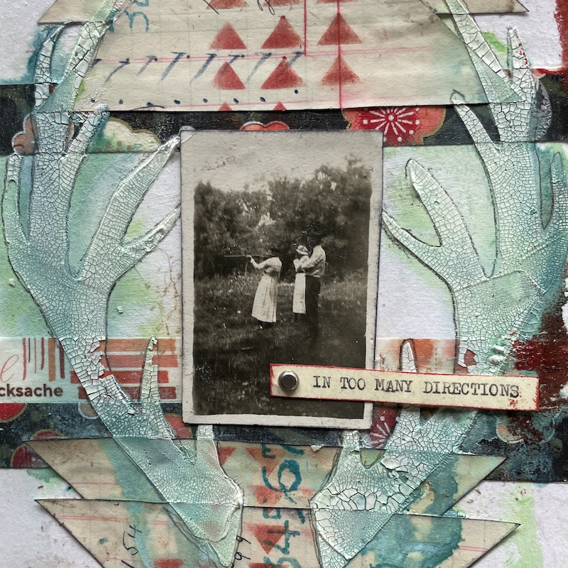 Step #3 Stencils: Place the Antlers Small Stencil down over the collage elements and hold in place with washi tape. Using a palette knife or gift card, spread crackle paste through one antler at a time when dry. Let crackles appear without heat setting for the best effect. 😉