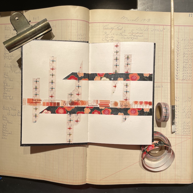 Step #1 Washi Layer: Place several washi tapes down in a pleasing pattern across your pages. Add glue stick under the tape for permanence and a layer of clear gesso over top.