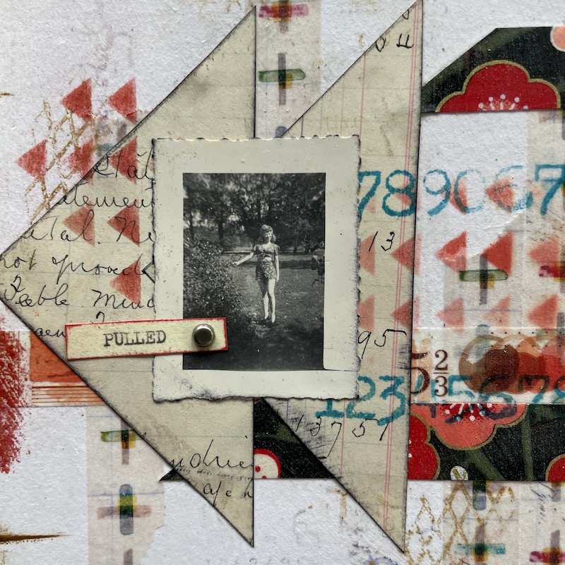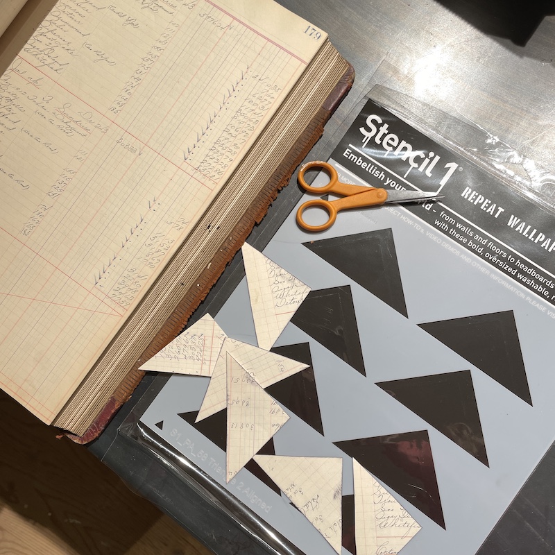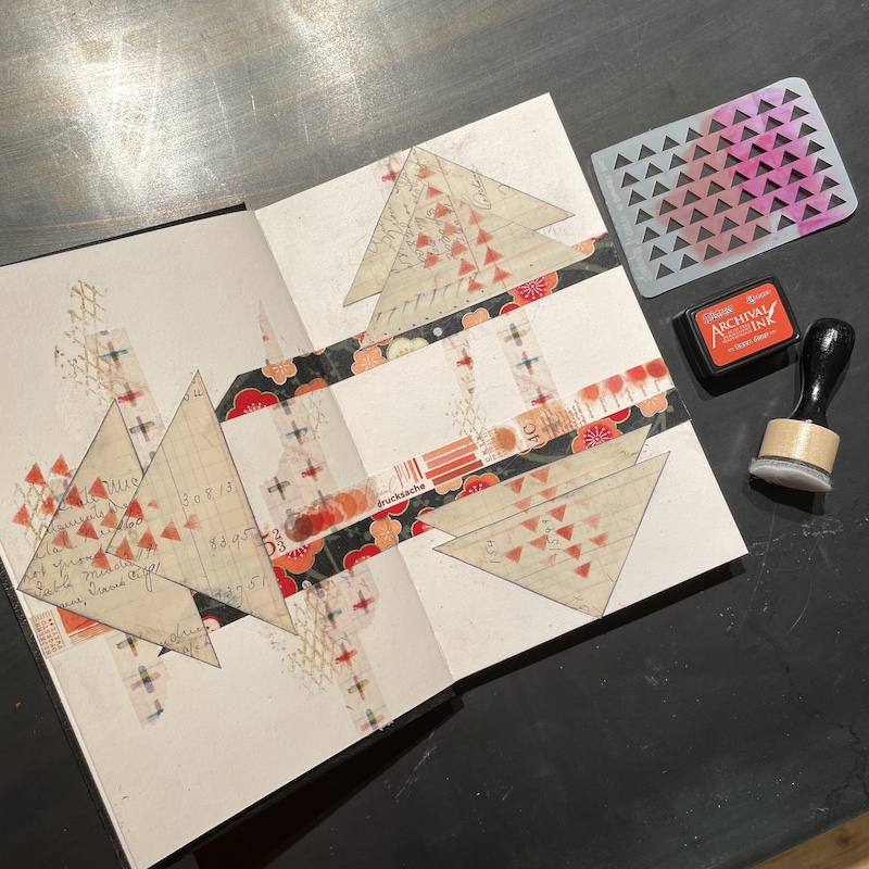 Step #2 Collage and Stamping: Using an old ledger page (or any collage paper you may have on hand) trace the Triangles 2 Aligned Stencil with a pencil and cut out triangles.