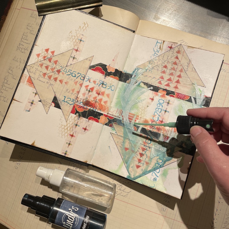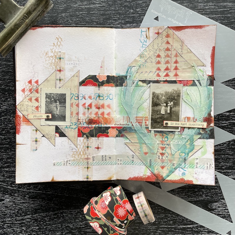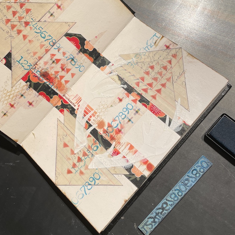 Step #2 Continued: Place triangles down in a pattern of your choosing, I overlapped mine. Glue down with a glue stick and cover in clear gesso. Add some stamping in red ink through the small triangle stencil in the Patterns 8 Pack Stencil to marry all the elements. I also added brown ink to a chain-link rubber stamp in a few areas and teal ink with a numbers stamp.