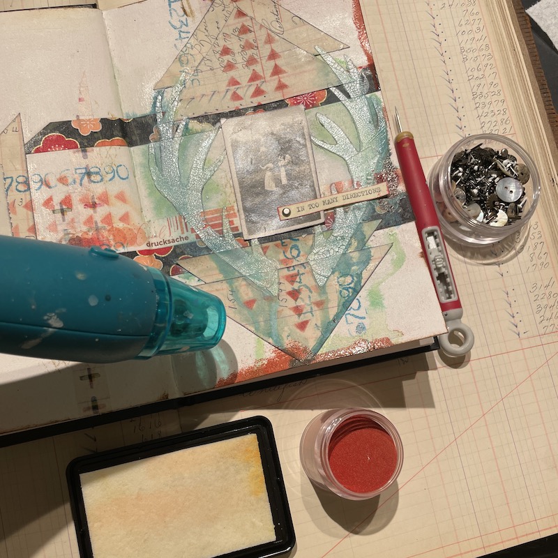 Step #5 Focal Point and Edges: Select 1 or 2 photos to place as a focal point, ink edges so they stand out, and glue down. I typed the phrase “pulled in too many directions” and affixed it with small metal Brads through both pages. The final detail consisted of edging the outside of all the pages with brown ink and smudging some clear embossing ink in a few spots around the edges. Heat set red baked texture powder for some edging drama.