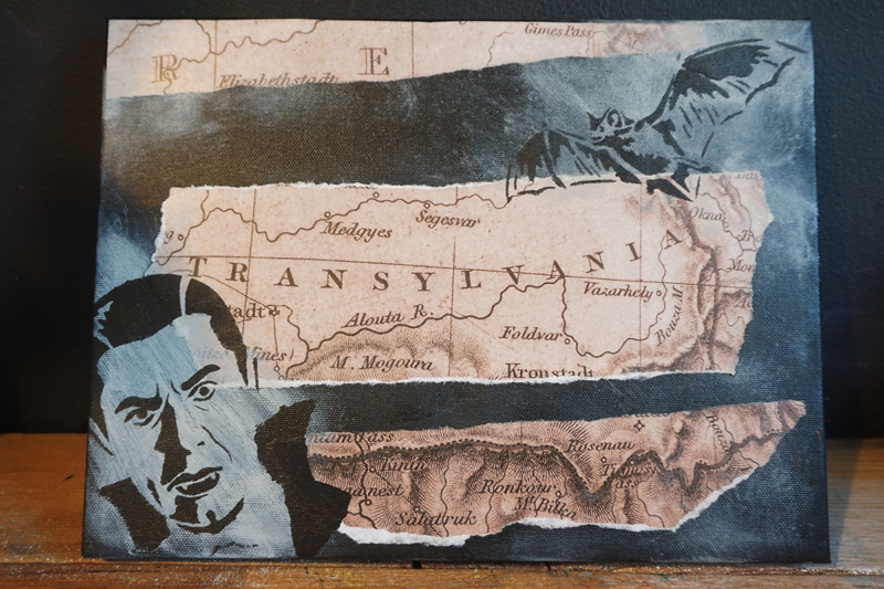 Turn your home into a spooky haunted house this Halloween! Use various Stencil1 Halloween stencils, paint, mixed media, and decoupage materials to create haunting paintings and portraits that look like they were taken straight out of Dracula’s castle. Perfect decor for any Halloween party. Here, we used the Stencil1 Dracula stencil and Bat stencil, and a map of Transylvania we found in a book!