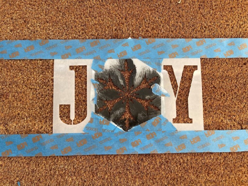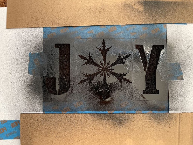 I cut up our cargo font stencil and our 11×11 snow flake stencils to make the word. I used some spray adhesive on the back of the stencil and taped it in place.
