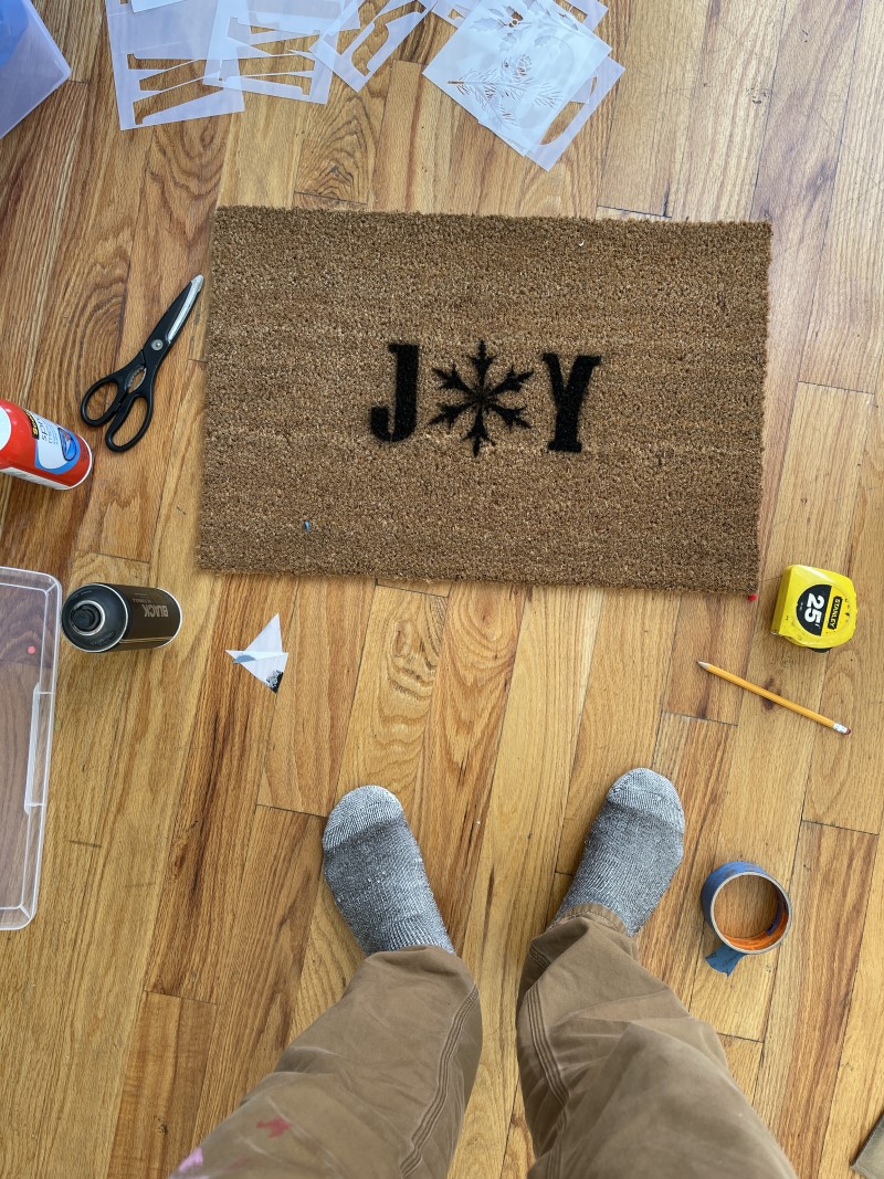 A custom mat is a one of a kind welcome. I wanted to use the snowflake in a word and JOY is a great word to welcome some guests with.