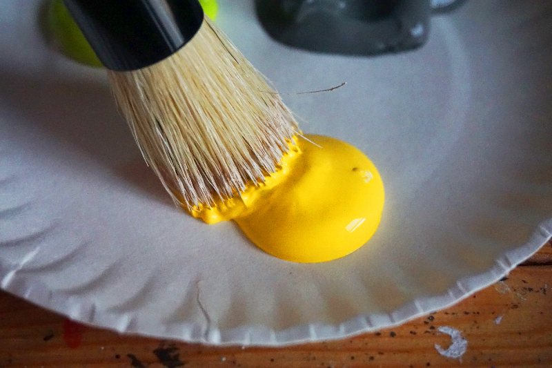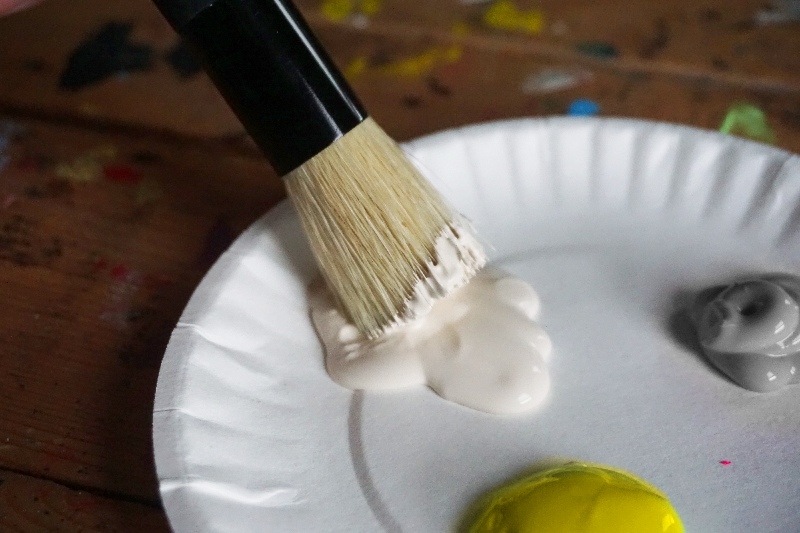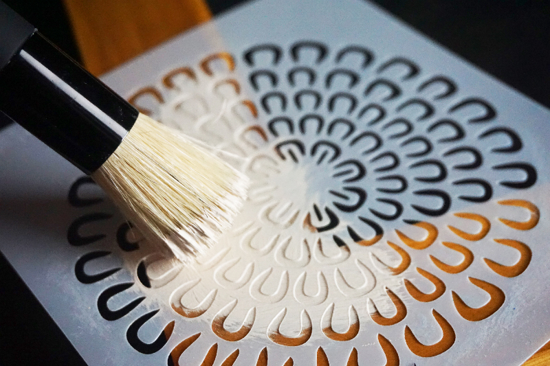 With a brush and the paint color of your choice, start painting away using a dry brush method. Dip your brush into your paint, then dab the excess paint on another plate or paper towel to prevent any bleeding underneath the stencil.
