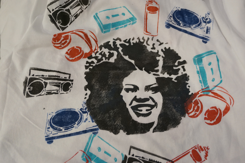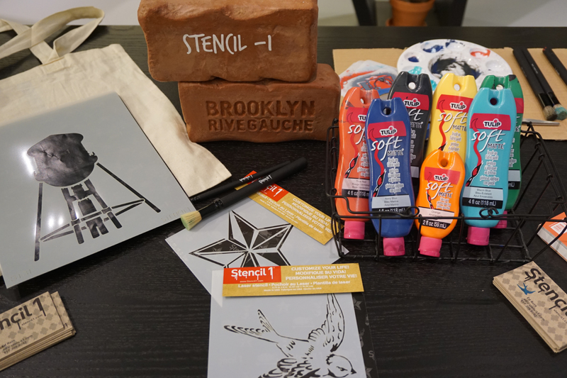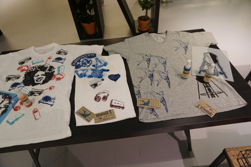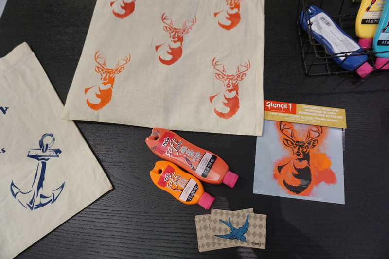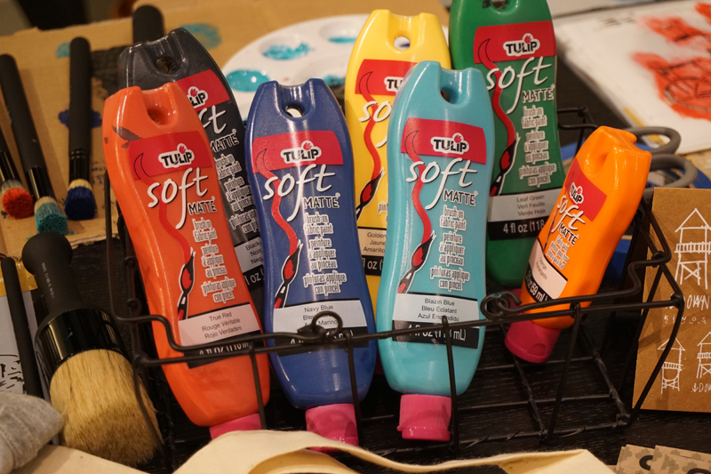 I set up my demo materials – Stencils, brushes, t-shirts, totes, and Tulip Fabric paint!