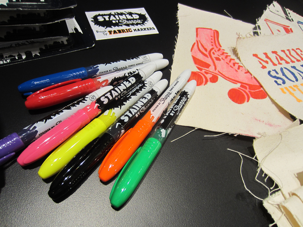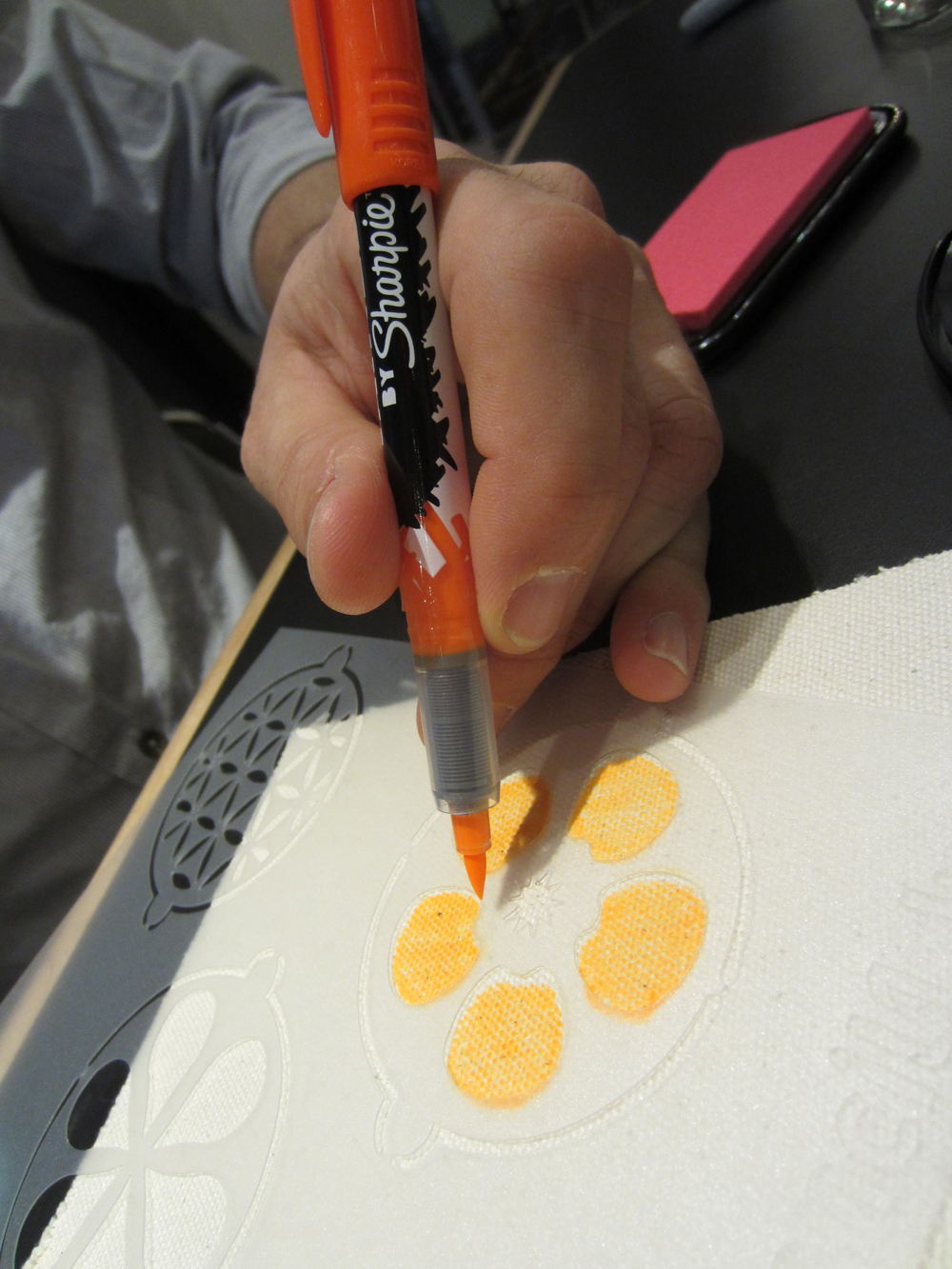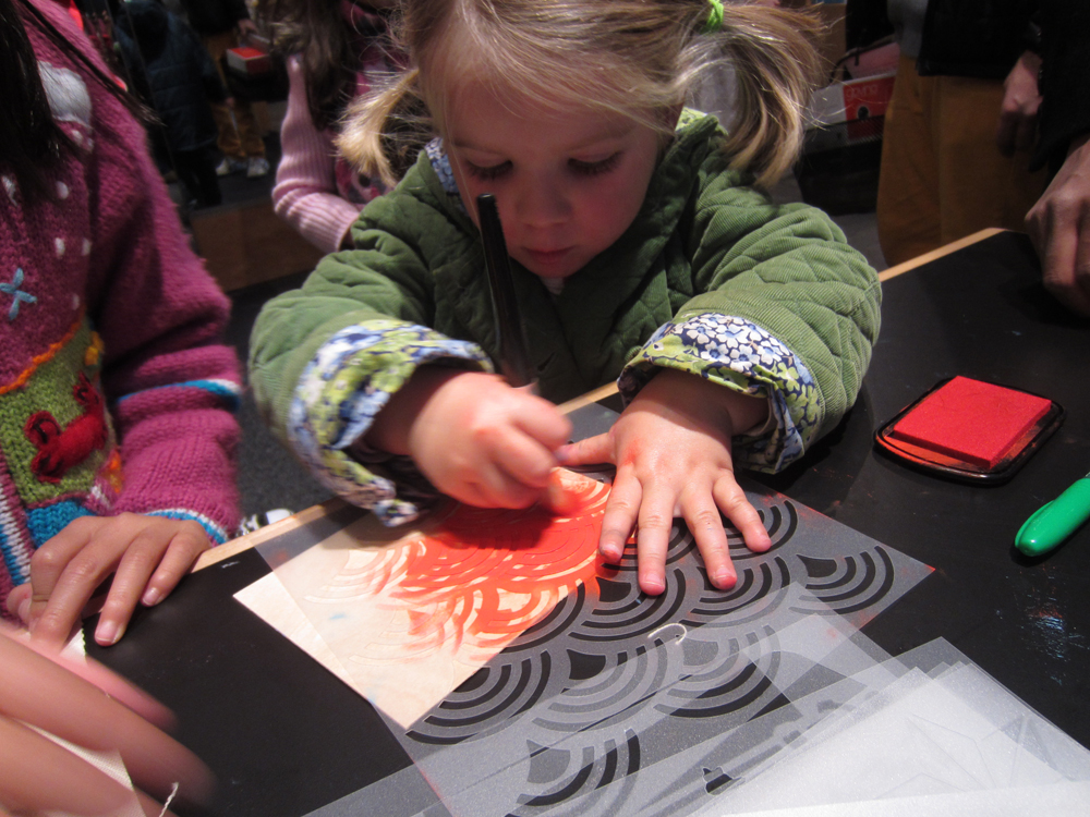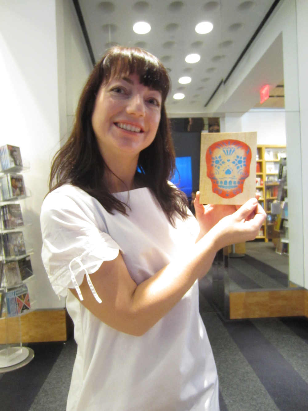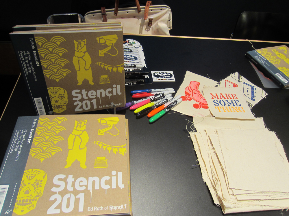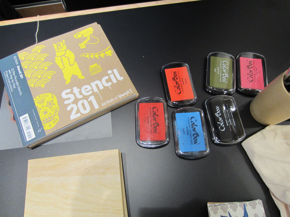 In 1995, I interned at the SFMOMA. The museum was just built and I color corrected images in their digital lab among other things. I was thrilled just to be a part of the museum! Well, I had a new thrilling time at the SFMOMA when I did a book signing and demo/DIY table!  I basically let people from age 3 to 75 try out some Stencil1 stencils from Stencil 201 and they seemed to really enjoy it! We used Clearsnap’s COLORBOX Pigment Ink Pads to stencil wooden postcards and Stained by Sharpie fabric markers to stencil canvas patches.  Here’s a few images from the event. Thank you SFMOMA and those who attended, great job!