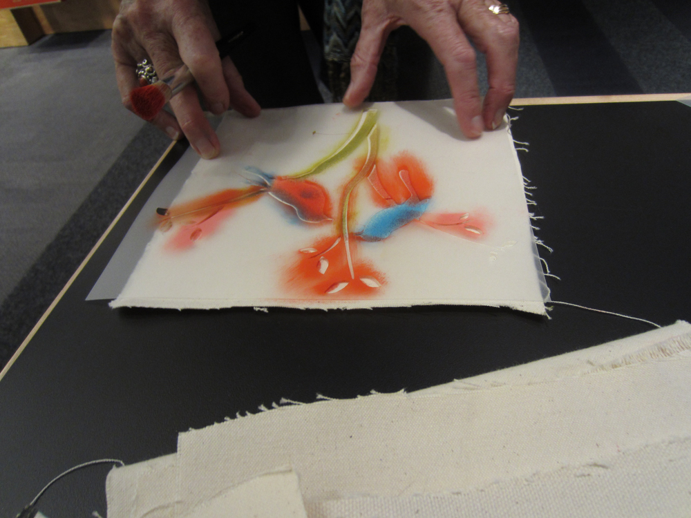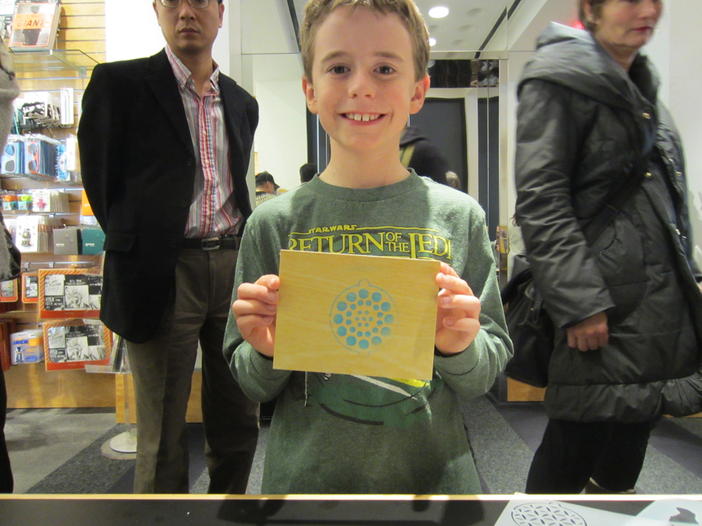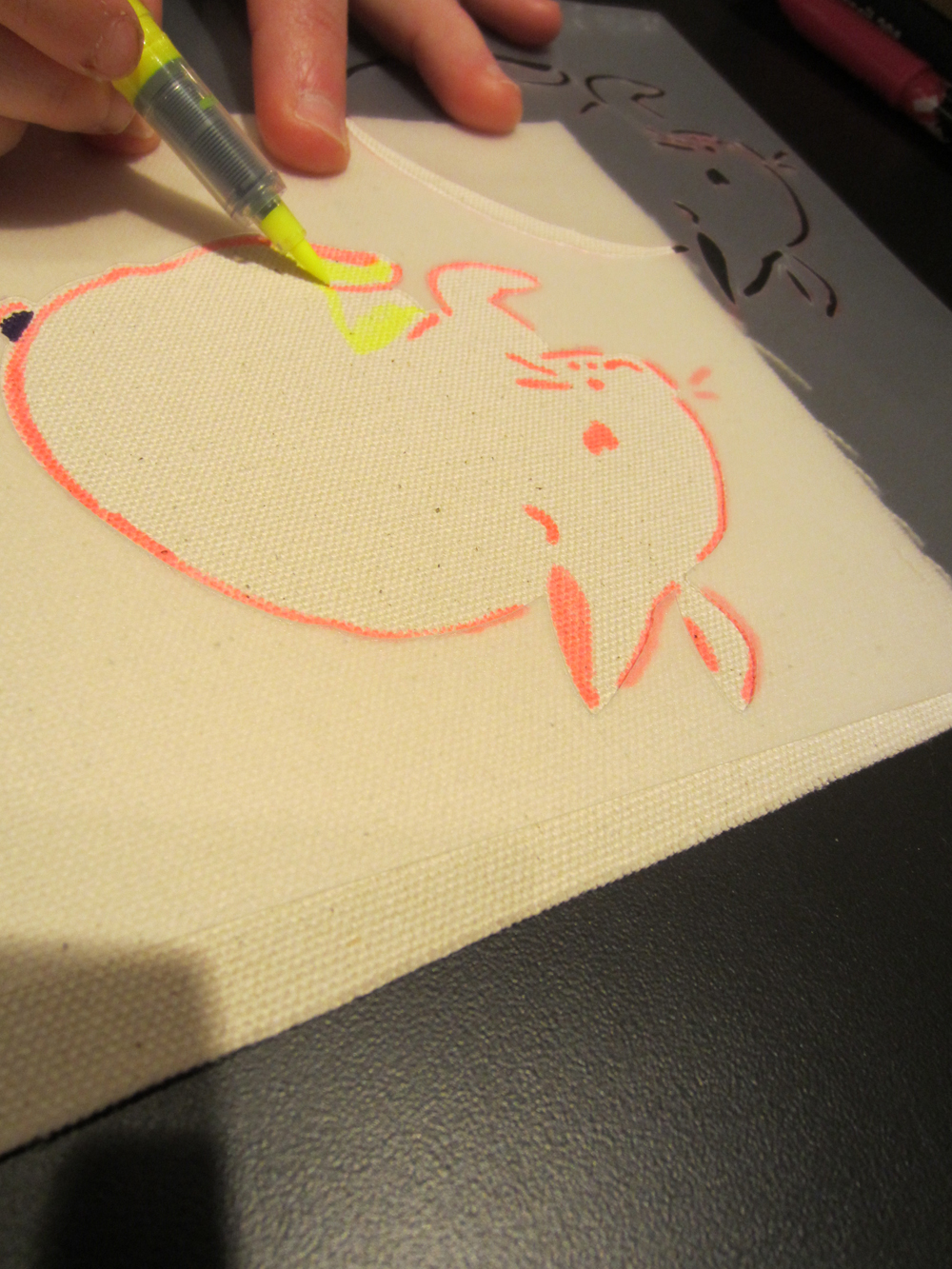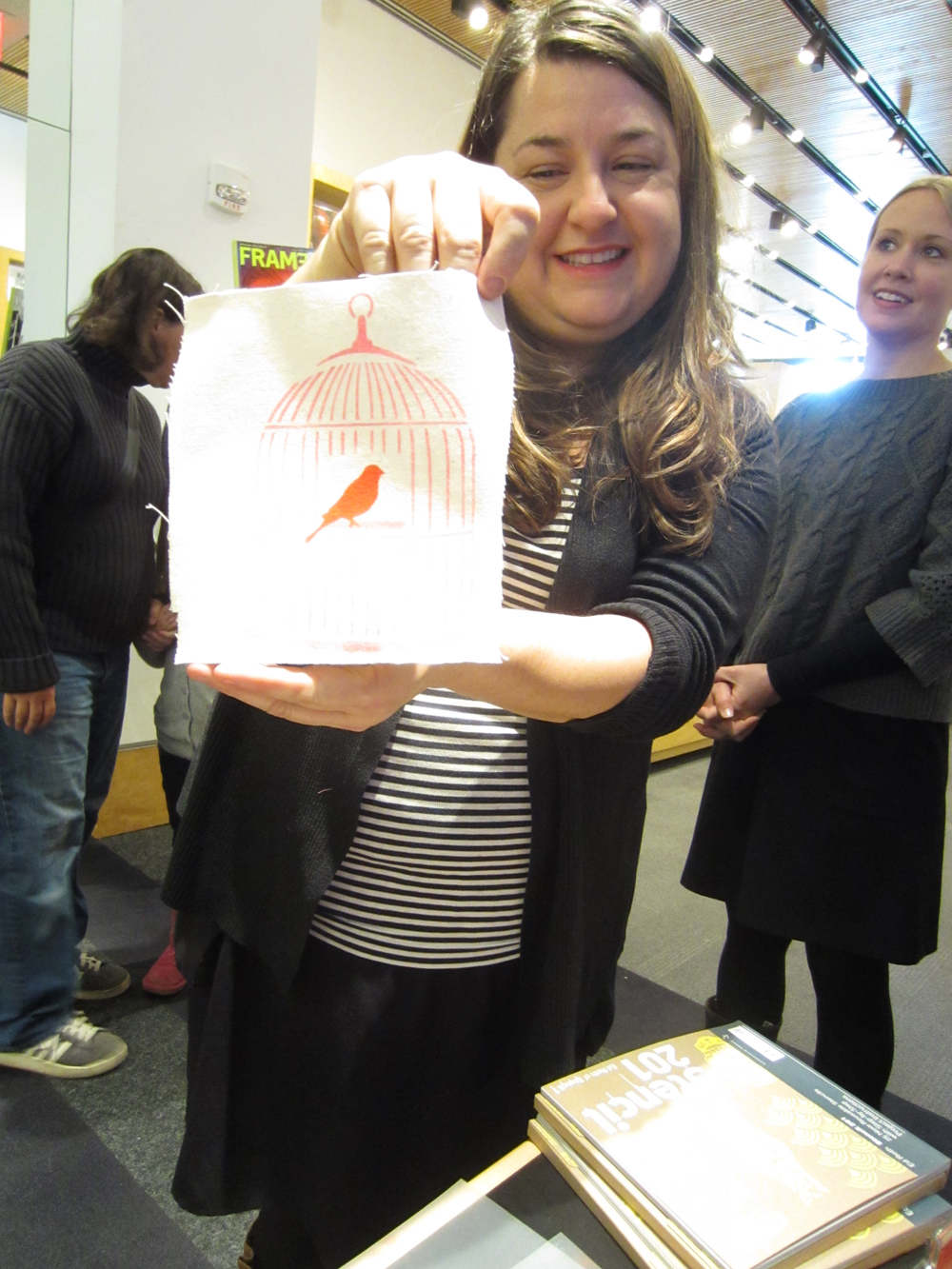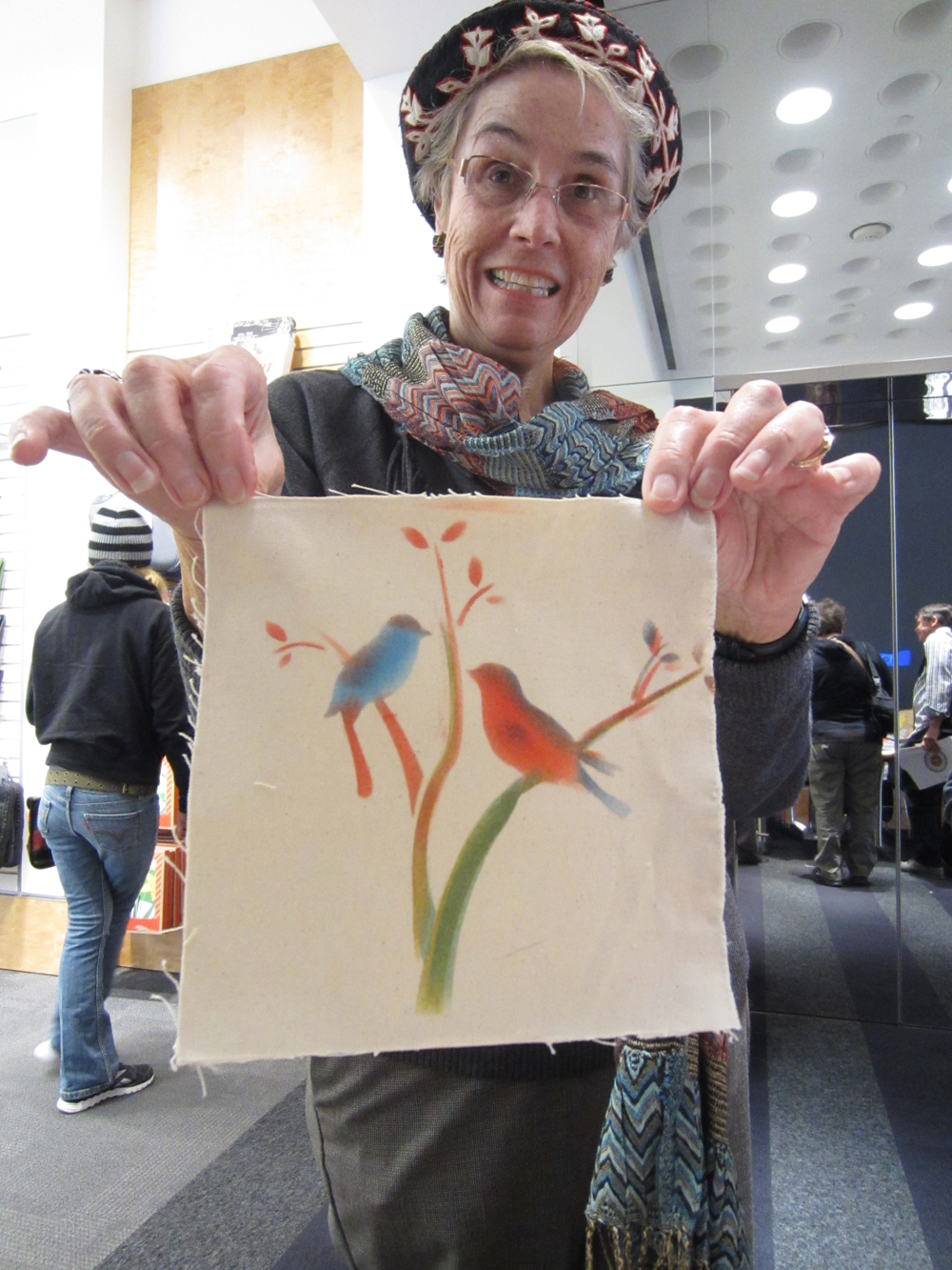 In 1995, I interned at the SFMOMA. The museum was just built and I color corrected images in their digital lab among other things. I was thrilled just to be a part of the museum! Well, I had a new thrilling time at the SFMOMA when I did a book signing and demo/DIY table!  I basically let people from age 3 to 75 try out some Stencil1 stencils from Stencil 201 and they seemed to really enjoy it! We used Clearsnap’s COLORBOX Pigment Ink Pads to stencil wooden postcards and Stained by Sharpie fabric markers to stencil canvas patches.  Here’s a few images from the event. Thank you SFMOMA and those who attended, great job!