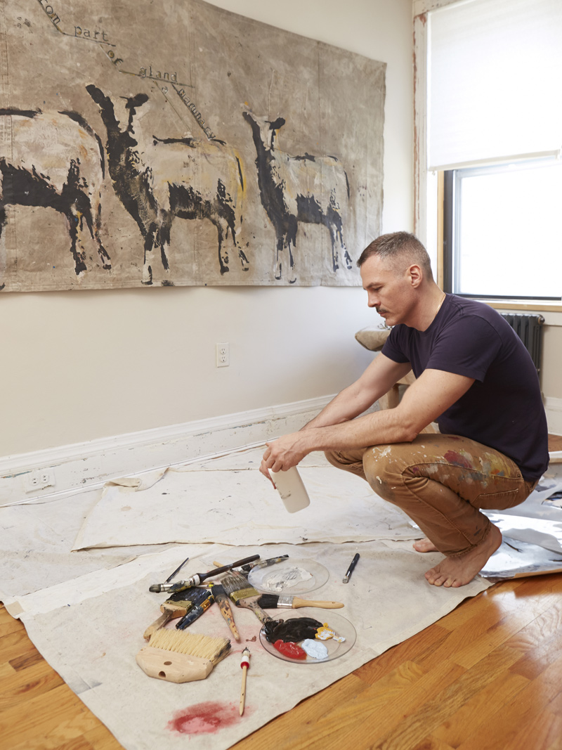 82″ x 48″, Acrylic and fabric paints on vintage canvas tarp