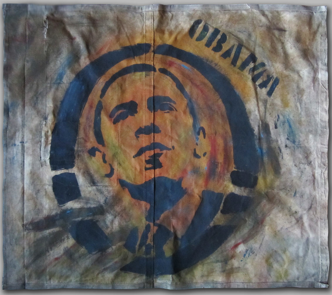 48″ x 82″, Acrylic and fabric paints on vintage canvas tarp