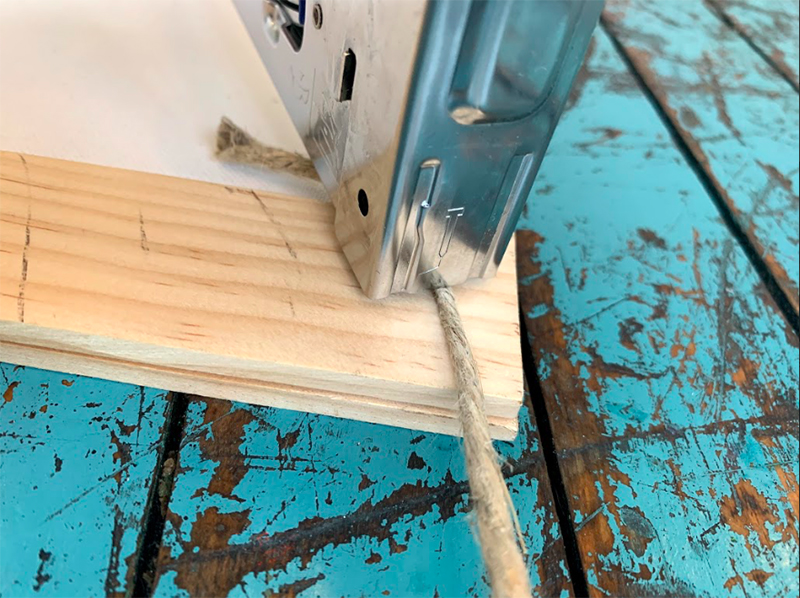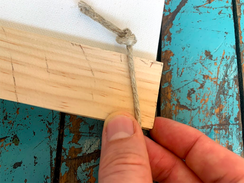 Then, use some rustic twine, measure it to create a nice triangular hanging shape and tie knots about 2 inches from the end of the rope on each end.