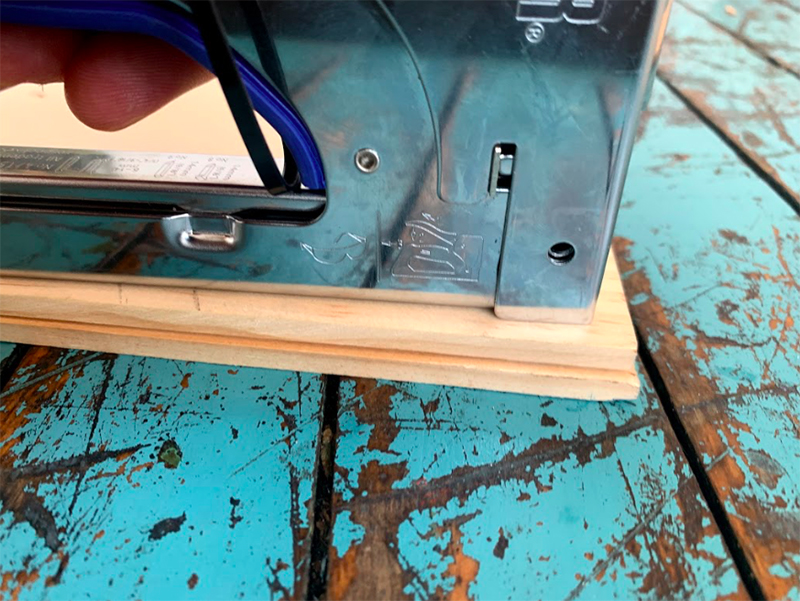 Next, staple it all together with a stapler gun. The staples just reach through to the other piece of wood. You can then hammer then in further for a secure fit.