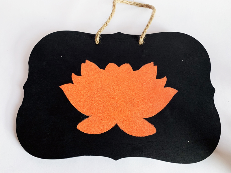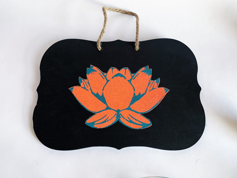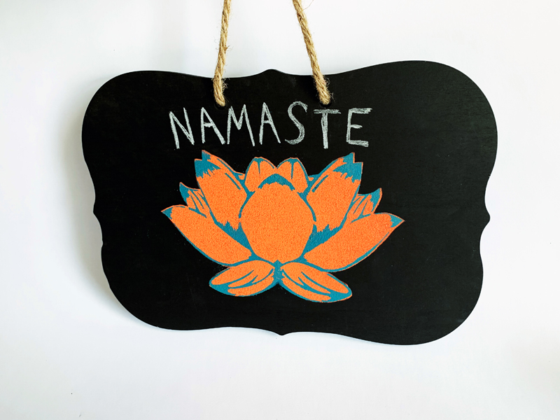 The lotus is done! Since this is a chalkboard design, you can add a custom chalk saying, we wrote NAMASTE using a thing chalk pencil, available at most art supply stores.