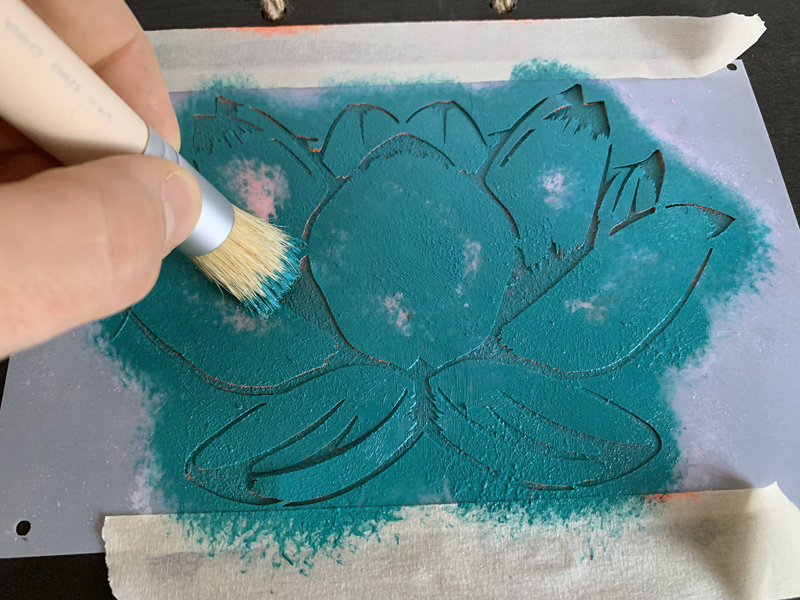 Using a different color, stencil in the open areas of the design. Again, a little paint gives the best results. Paint in an up and down or tapping motion.
