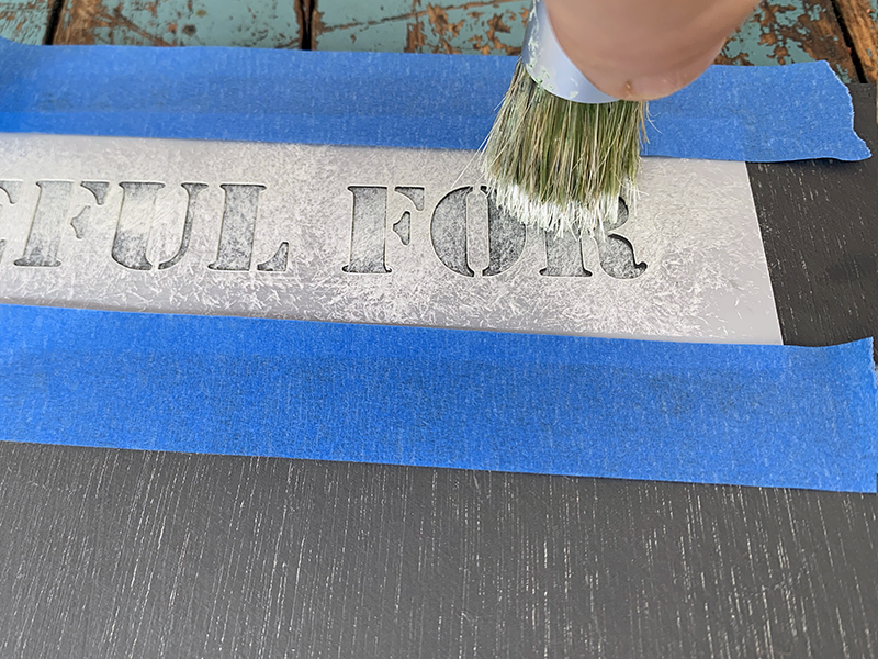 Use painters tape and secure the stencil in a centered top position. Use acrylic paint and lightly paint in the saying for a chalky effect.