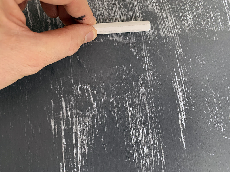 Let the board dry 24 to 48 hours before you Condition the board with chalk. Prep the chalkboard by holding your chalk sideways, or horizontally, and drag the chalk up and down across your chalkboard. This is done to prevent “ghosting”- when your chalk writing won’t fully erase.