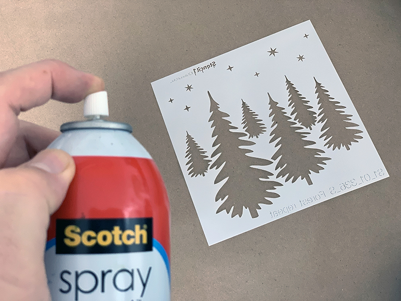 To start, spray some low tack spray adhesive to the back of the stencil and let dry for 30-60 seconds.