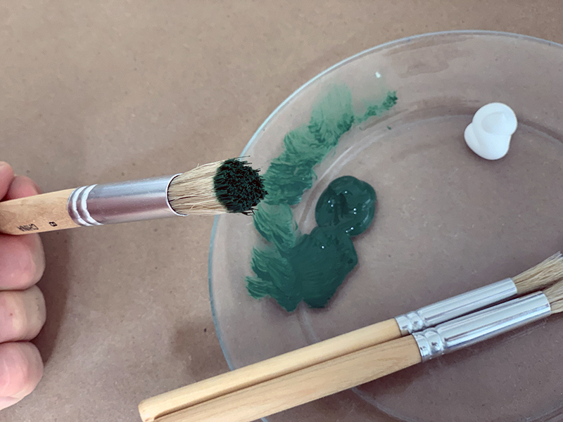 Then, take a new brush with white paint on it. Use very little paint and dry it off a lot on the plate. Tap very tightly to apply a snowy effect to your green trees.