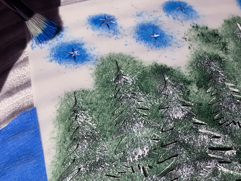 Finally, paint in your tiny stars with a small stencil brush and blu paint. Again, a tapping motion will fill in these little openings.