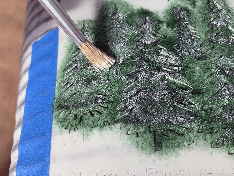 Next, using a dry brush technique(very little paint) apply green paint throughout the design until filled in. Usually, this takes 2-3 built-up applications.