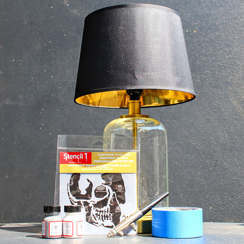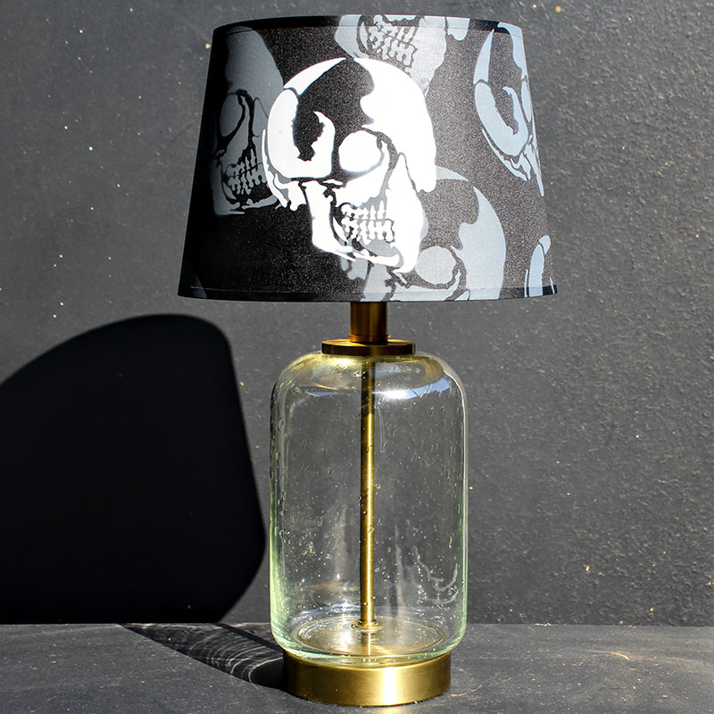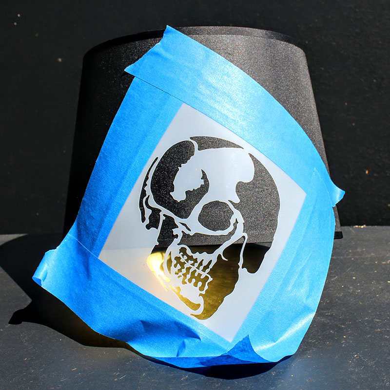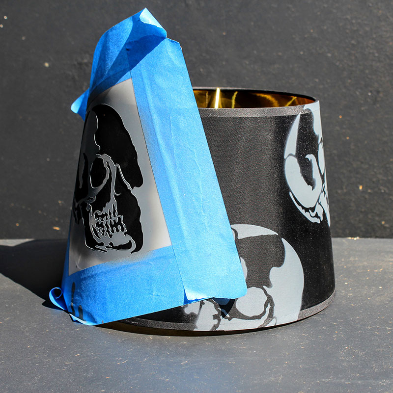 Now remove the lampshade, position the stencil for your first skull, you can offset and position at random.