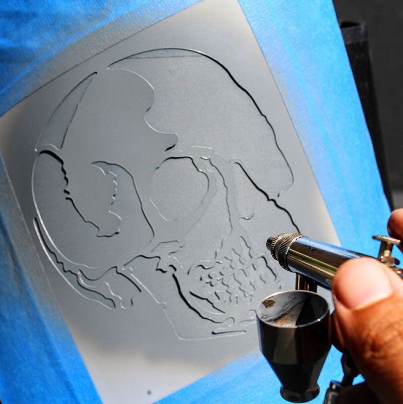 Load your airbrush gun with your grey paint, dilute if needed. Spray your first skull. You might need multiple coats depending on how your paint and fabric react with each other.