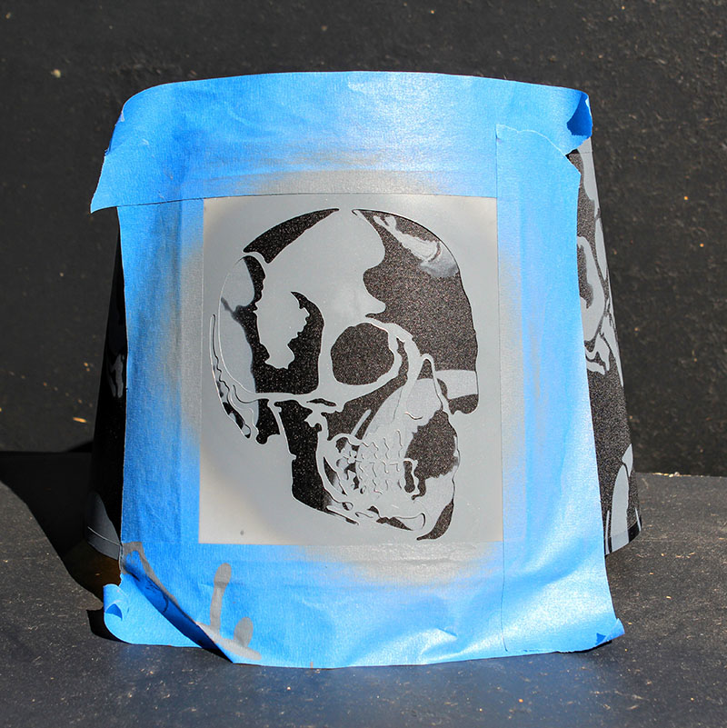 Once all the grey background skulls are complete and dry, position the skull stencil in the middle of the shade. Using your white paint, spray over the stencil. Make sure to spray a few coats so that the white will really pop.