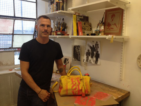 The other night was a little DIY-craft evening for Stencil1. Steve Madden had invited Ed to vamp up their Bdagmar cross-body satchel for a promo giveaway. We went to Vine Wine for a little refreshment (and in addition to our bottle of rose got these great Govino plastic wine glasses that are perfect for the studio). With the banana yellow canvas, Ed had so many stencil styles that would work. Go with a repeat pattern? An iconic image? Ed chose the EVOLVE design by Clark Clark, featured in his forthcoming Stencil Style 101, along with the repeat pattern rainbows. Of it Ed says, “I wanted to feature a guest artist in this project and chose Clark Clark, who is also a political activist. He designed the VOTE stencil for Obama’s 2008 presidential campaign and designed the EVOLVE stencil, which is very cool in my opinion. Here’s what Clark Clark said about it: