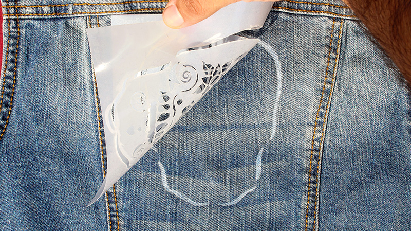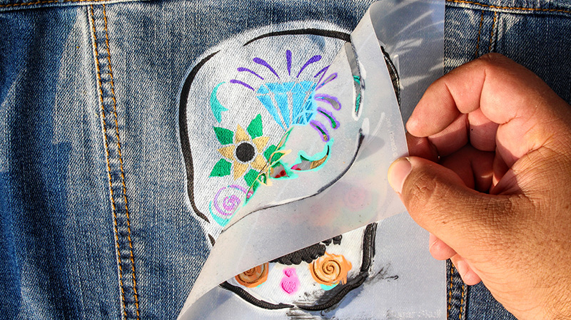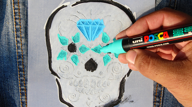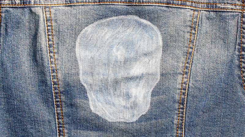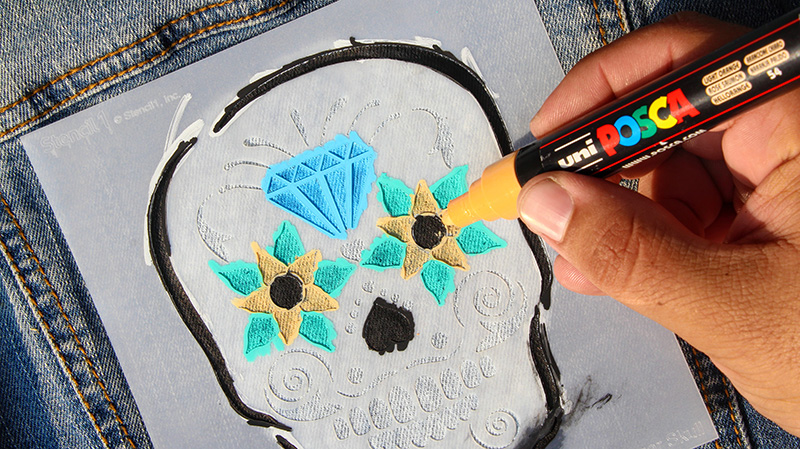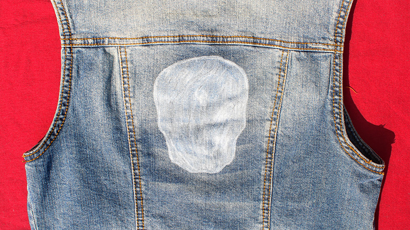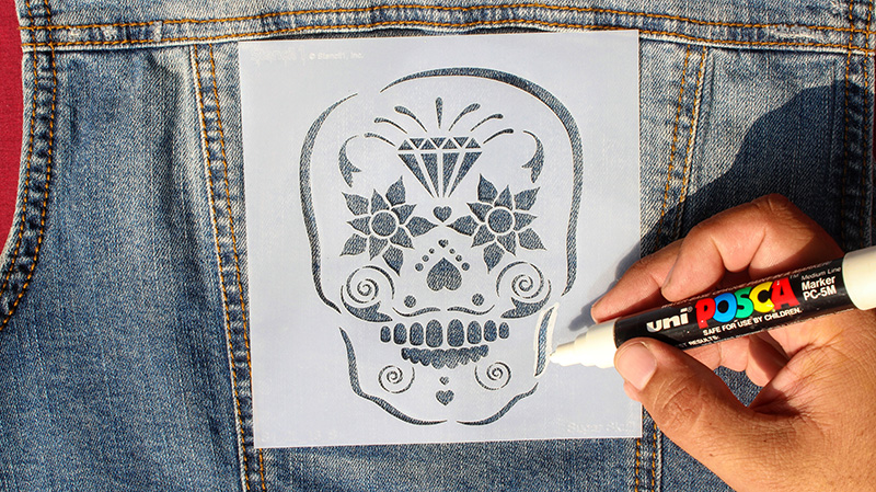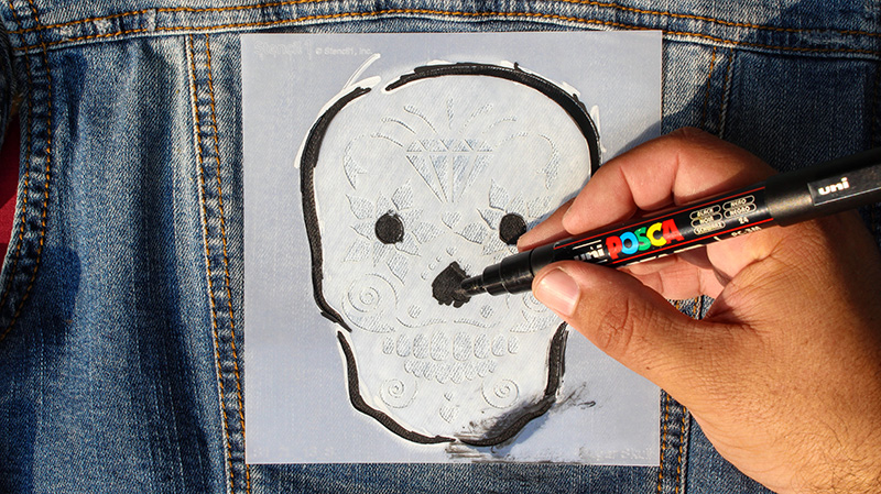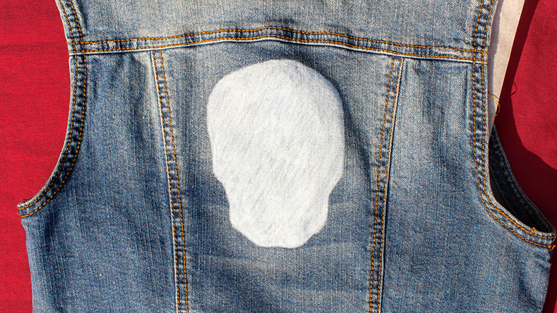 Realign and place your stencil back on your vest. Color in the outline of your skull as well as any other part you want black.